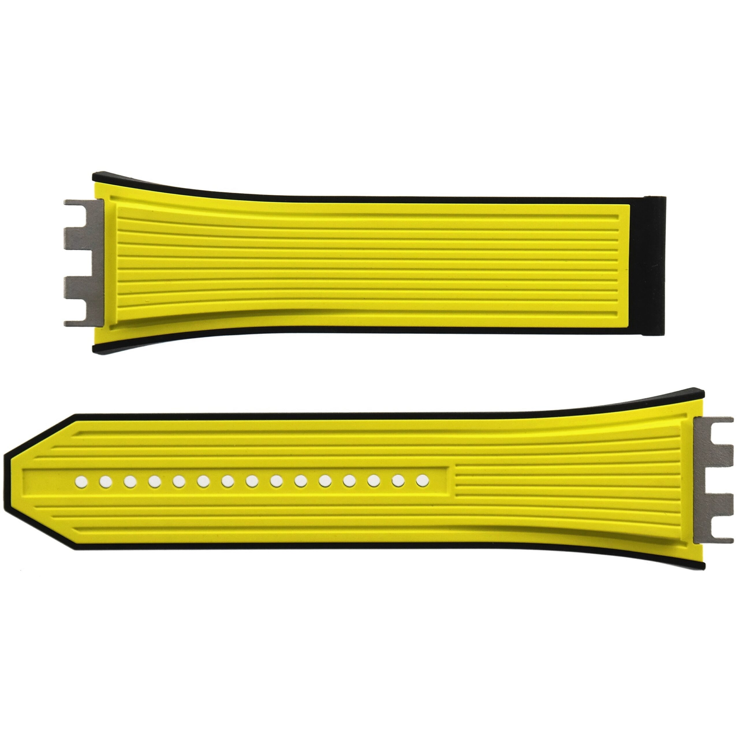 Black and yellow structured lined rubber straps with metallic inserts.