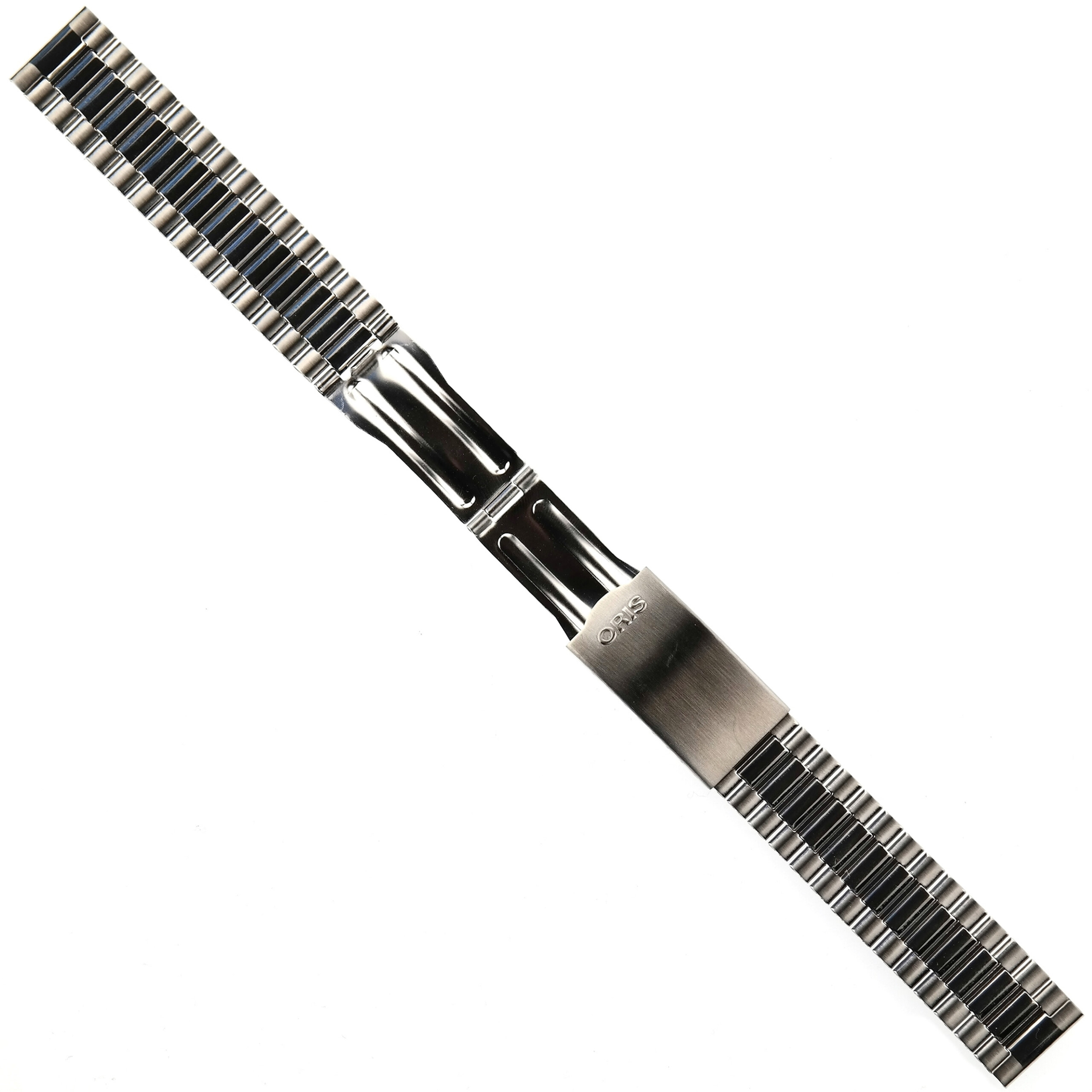 Ca. 175 mm length, ca. 235 mm extended length (with full open clasp). The bracelet is marked ORIS | STAINLESS STEEL.