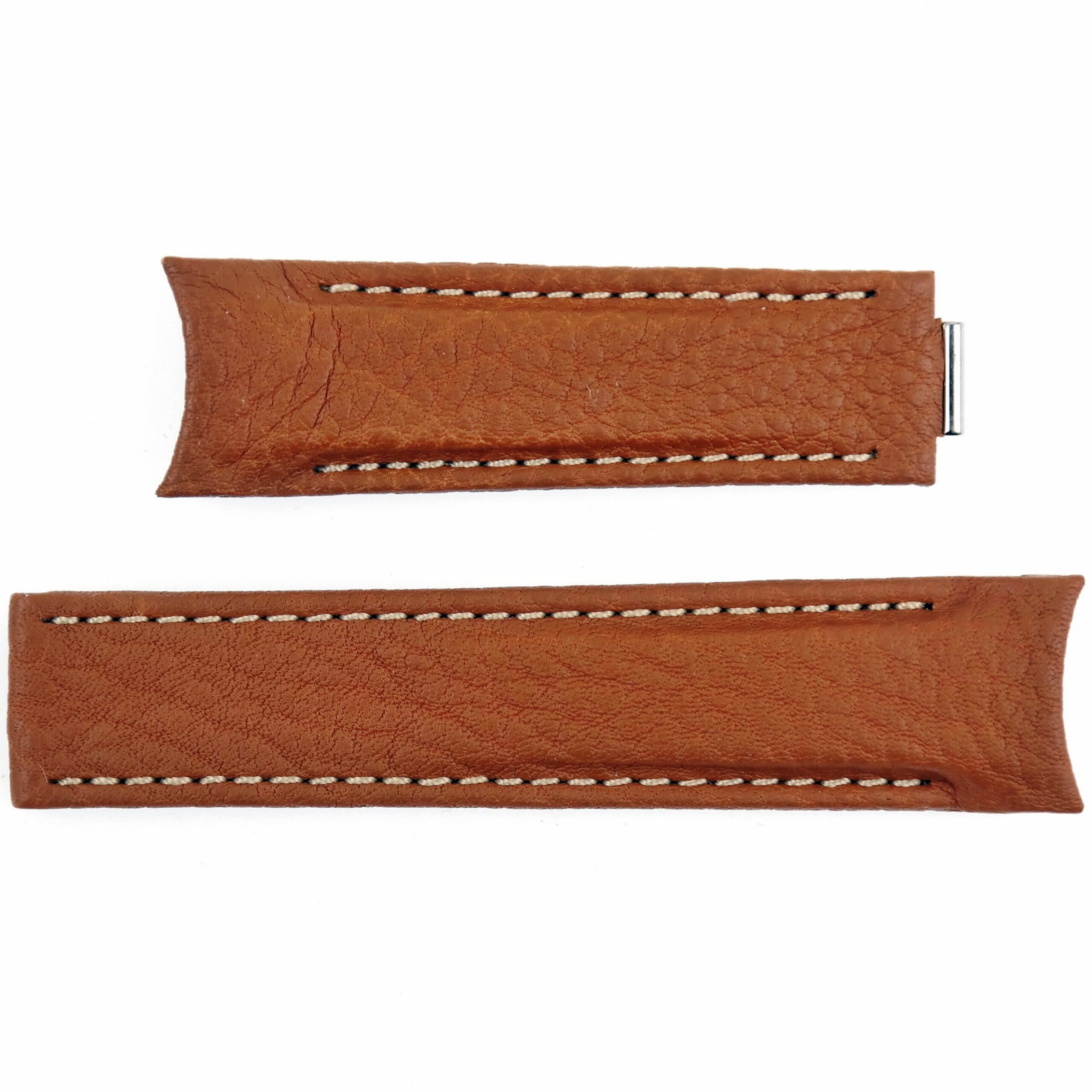 Camel brown genuine calf leather with white stitching, curved ends with metallic inserts.