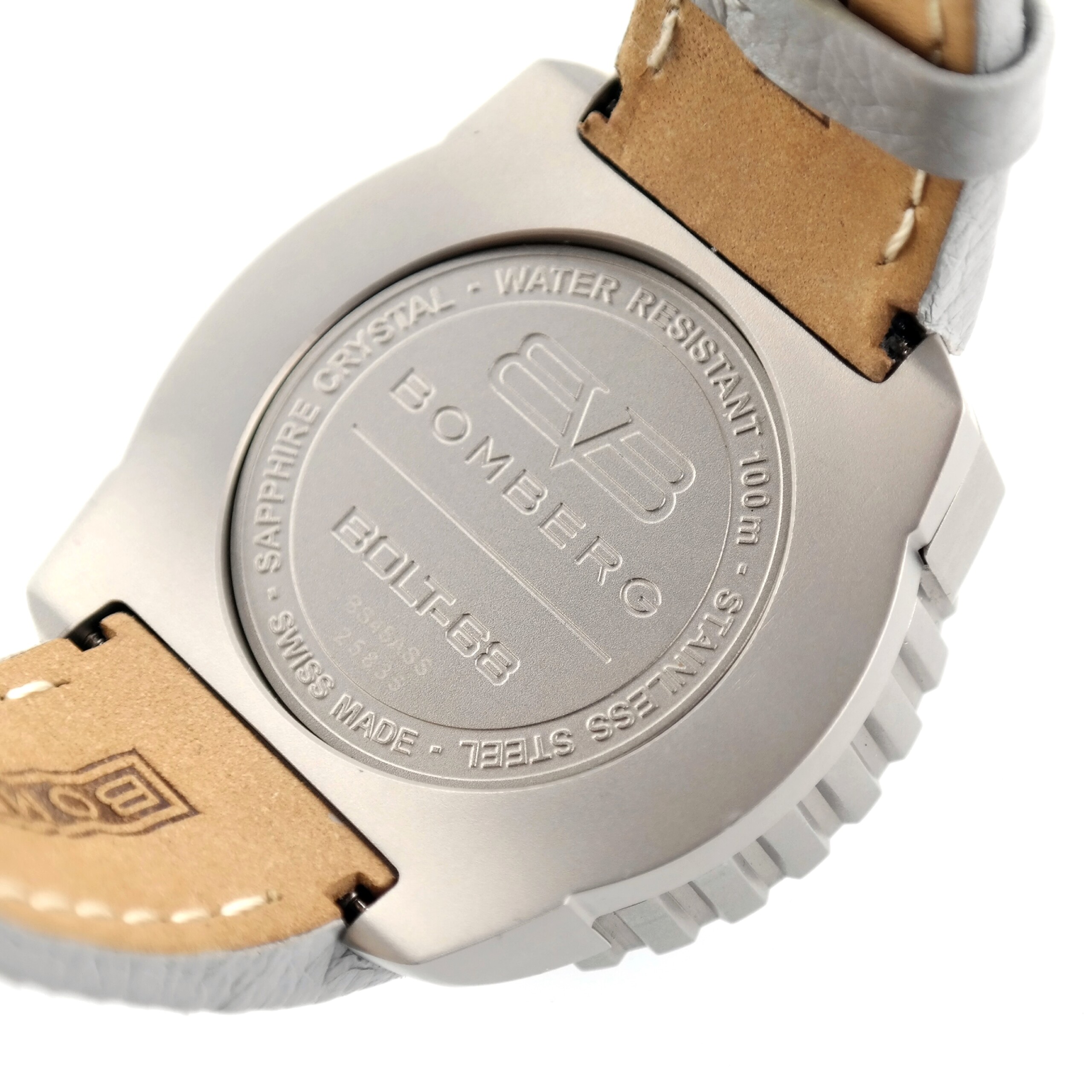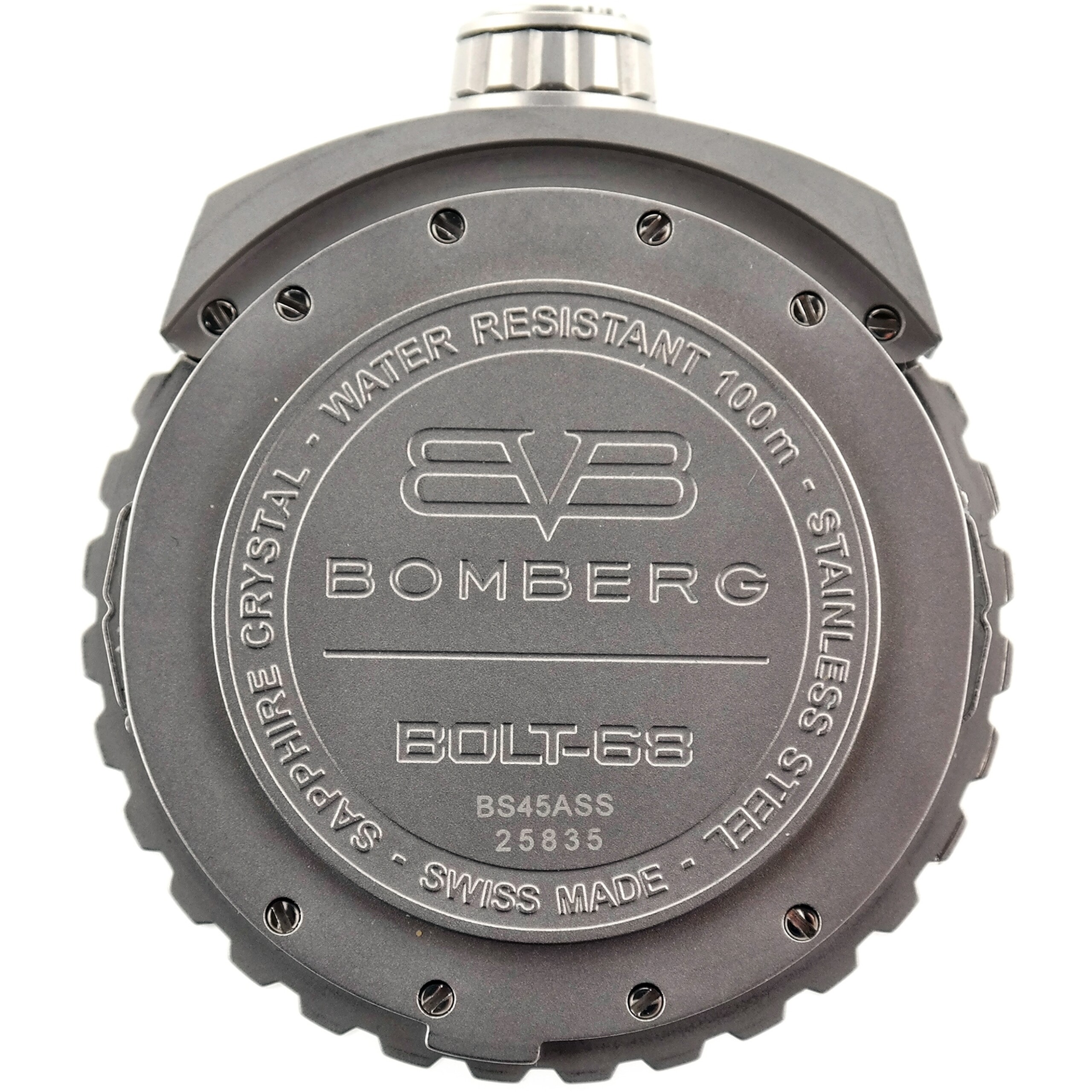 Solid case-back marked BOMBERG | BOLT-68 | BS45ASS | 25835 | STAINLESS STEEL | WATER RESISTANT 100 M | SWISS MADE | SAPPHIRE CRYSTAL.