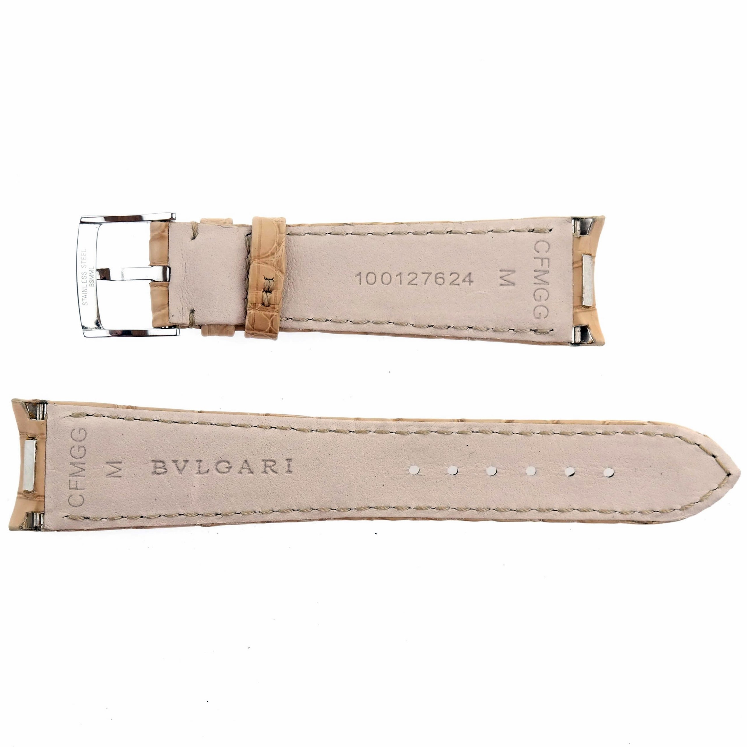 Short piece is ca. 70 mm, long piece is ca. 110 mm. The strap is marked BVLGARI | M | CFMGG | 100127624 .