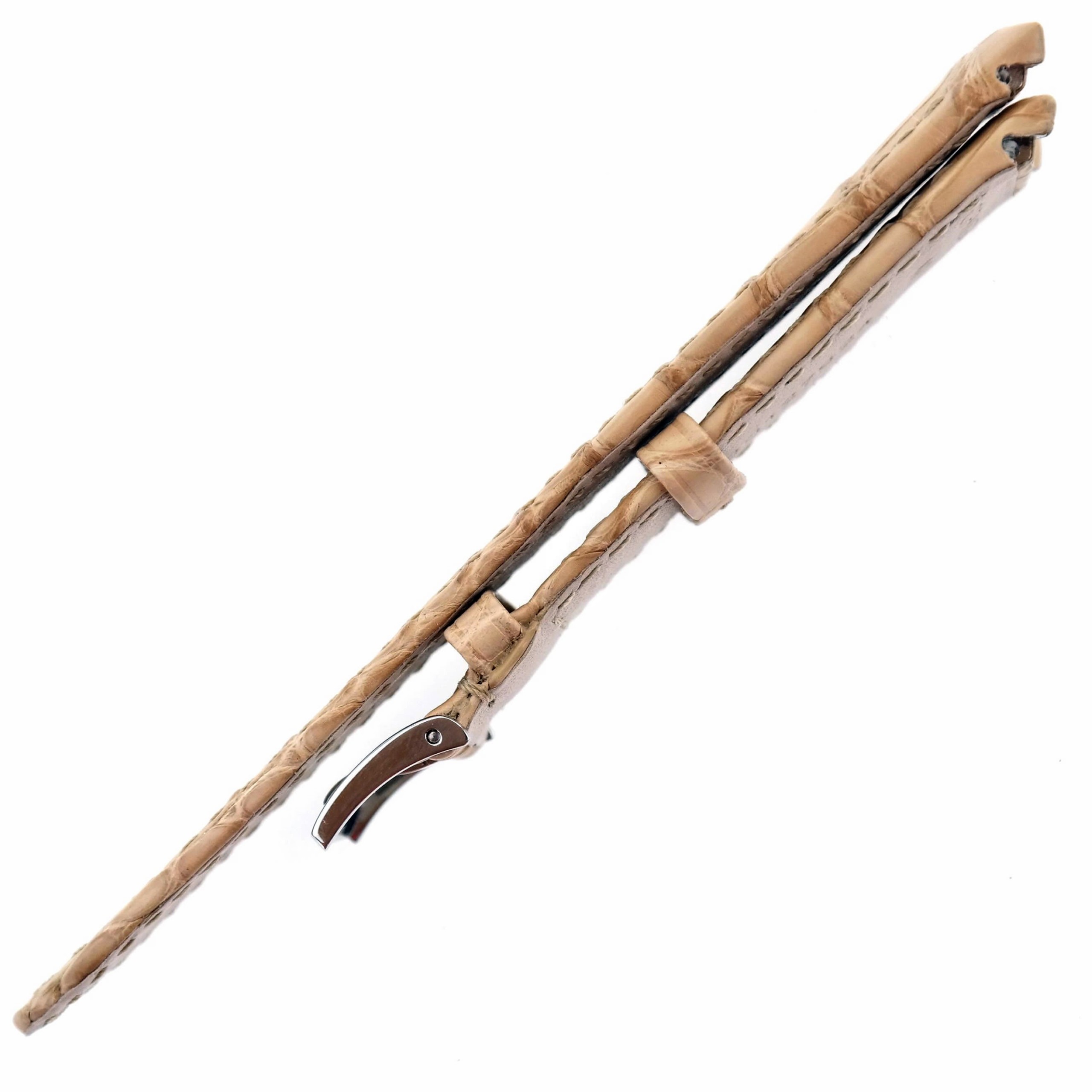 Beige crocodile skin on genuine leather with beige stitching.