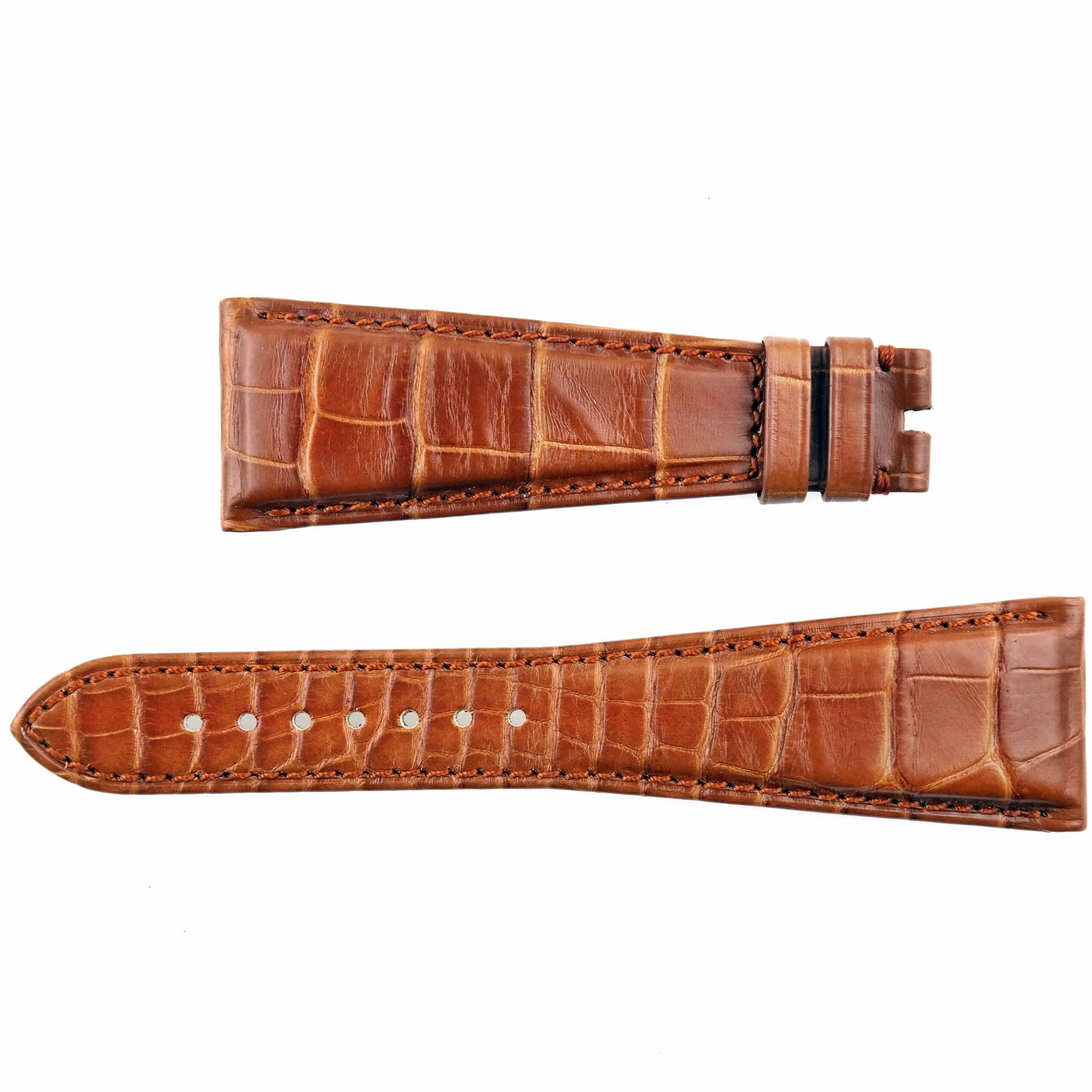 Brown crocodile skin on genuine leather with brown stitching.