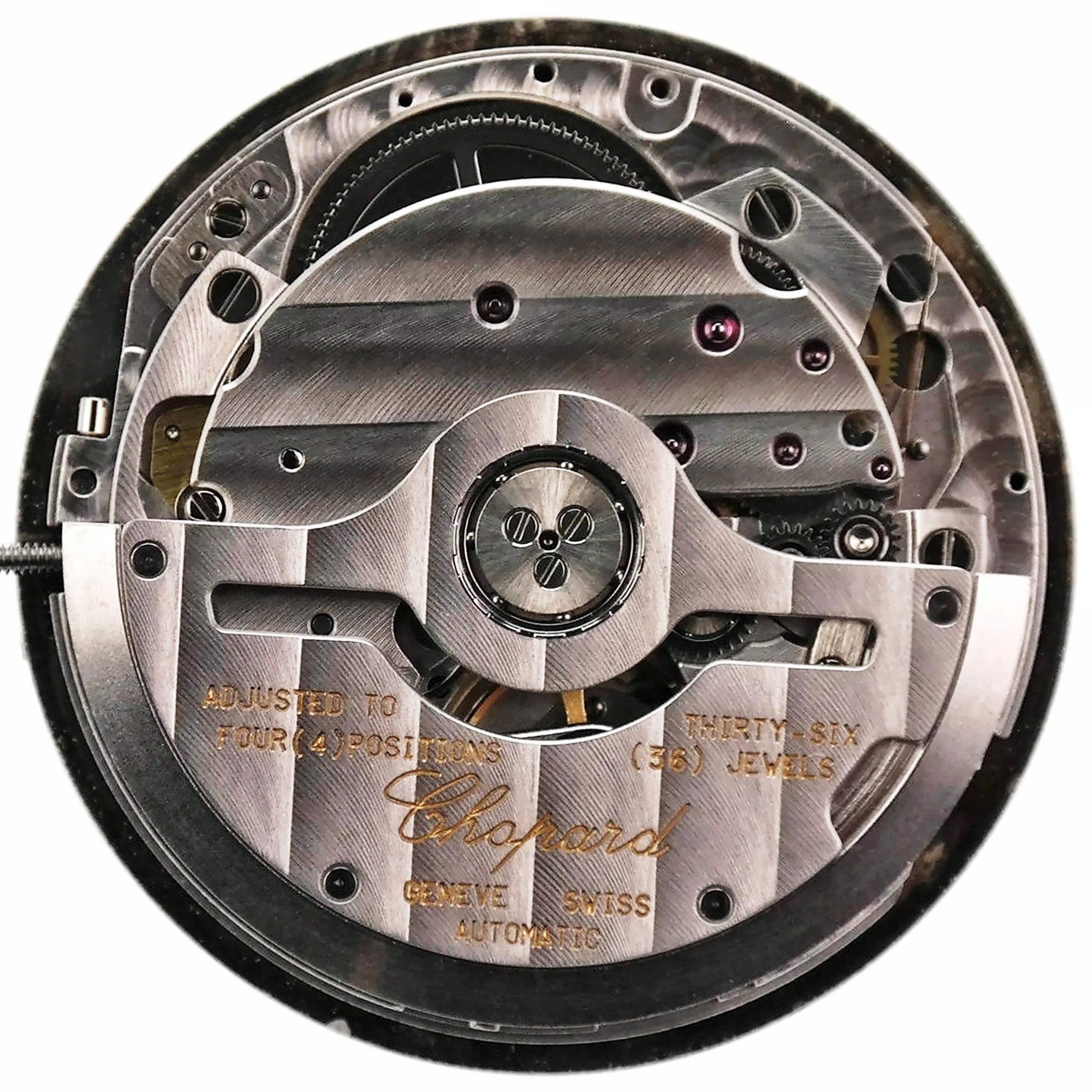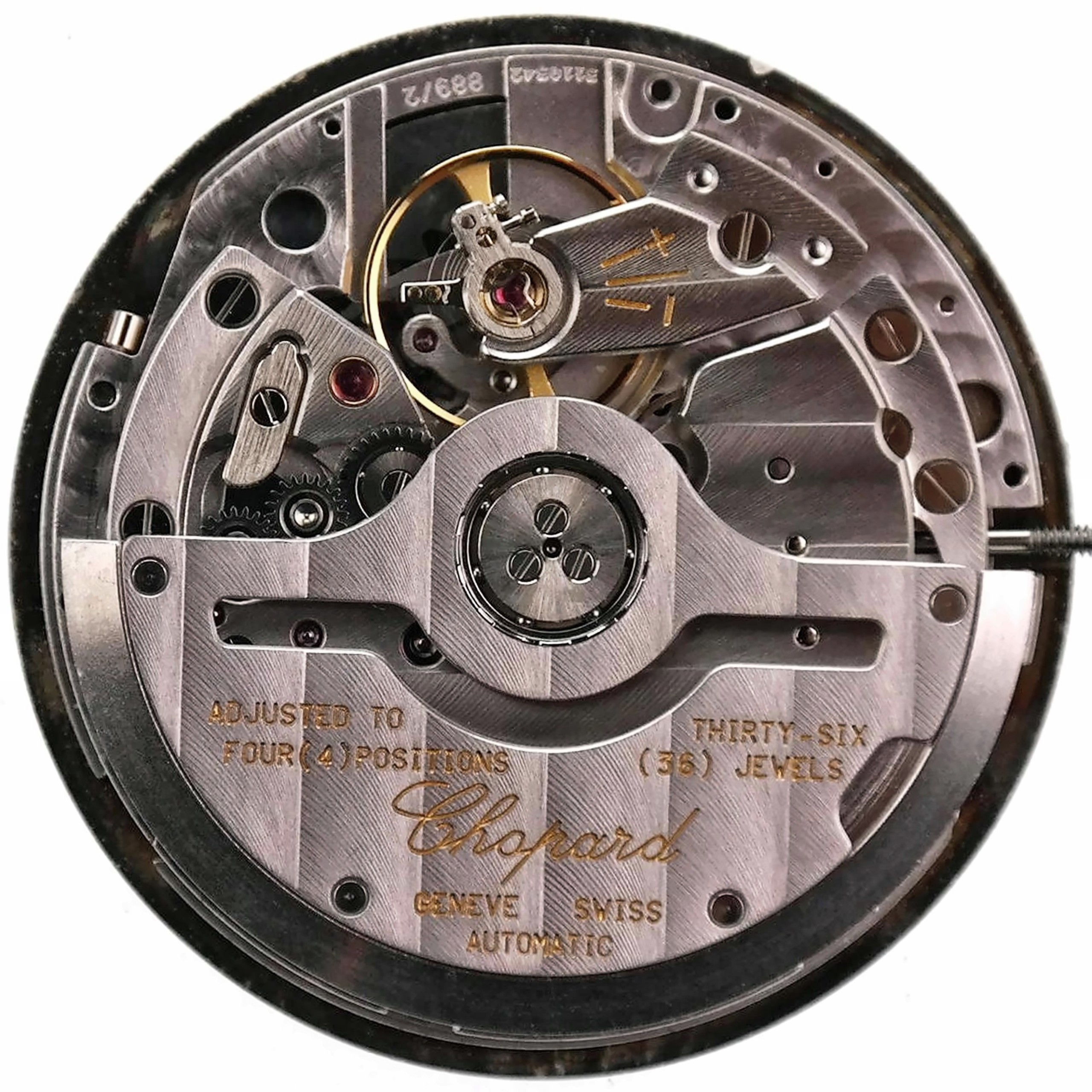 The movement is marked 889/2 | (serial number) . The oscillating weight is marked Chopard | GENEVE | SWISS | AUTOMATIC | ADJUSTED TO FOUR (4) POSITIONS | THIRTY-SIX (36) JEWELS