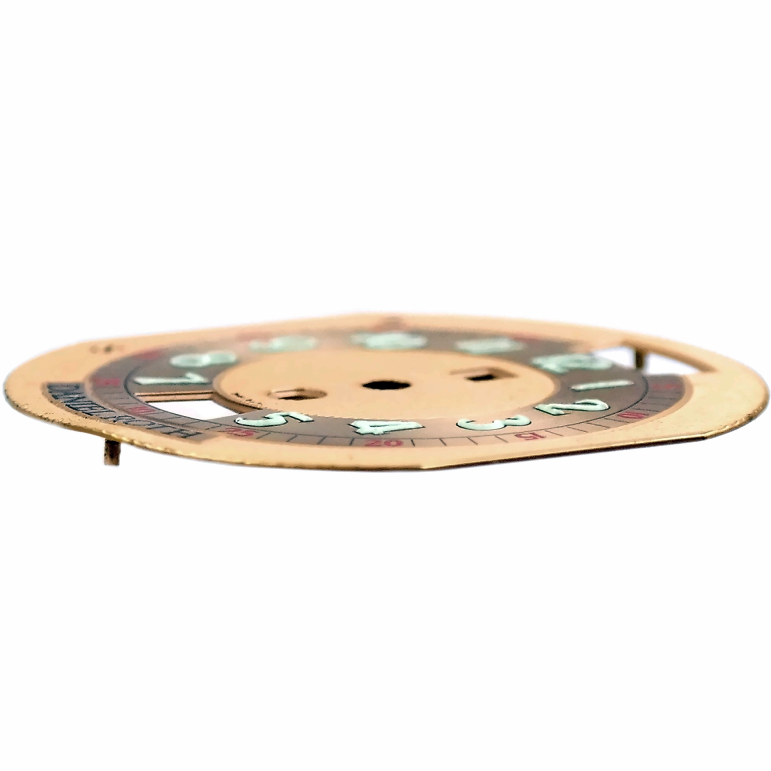 Salmon (bronze) face with black accents, luminous Arabic hours numerals, red and black indexes and numerals.
