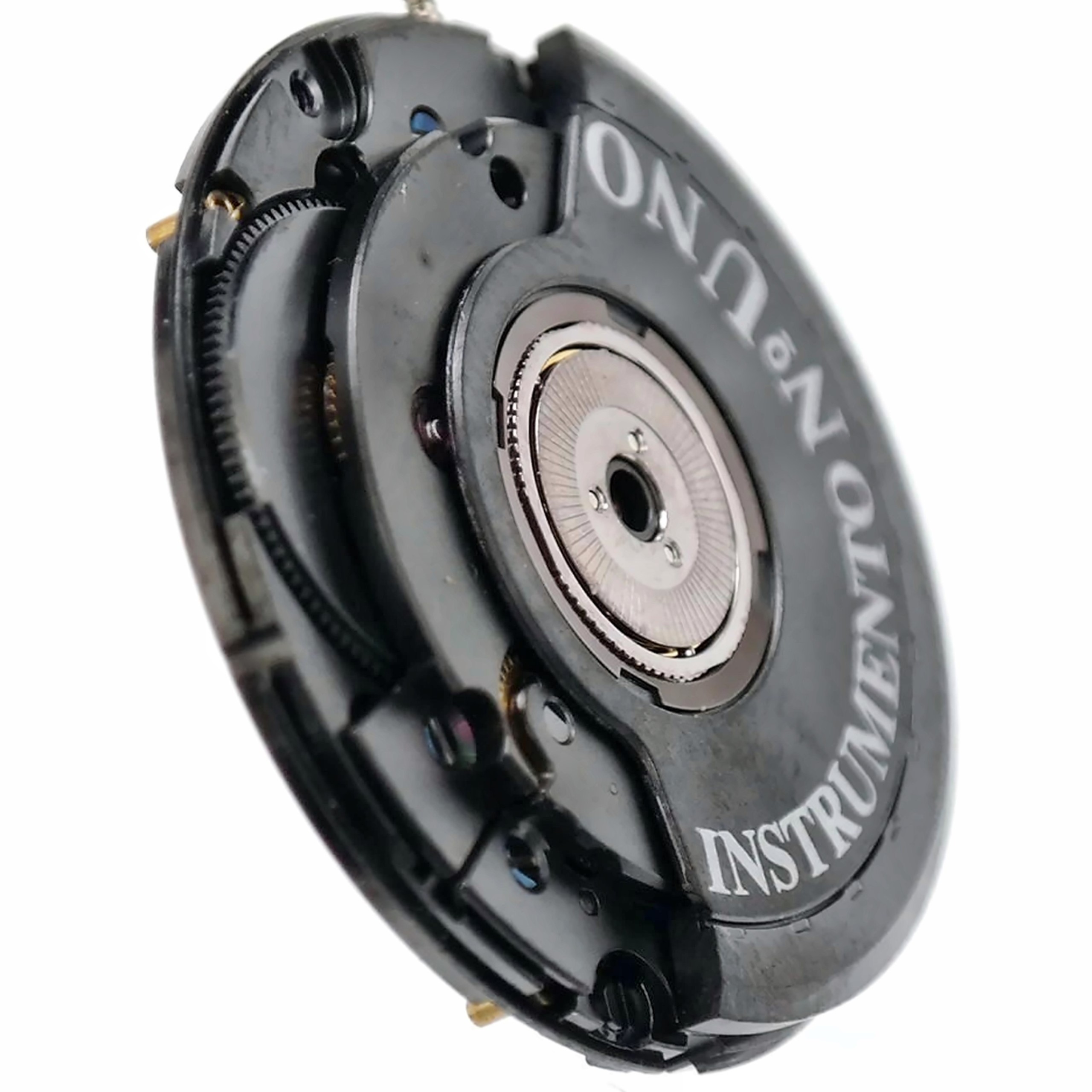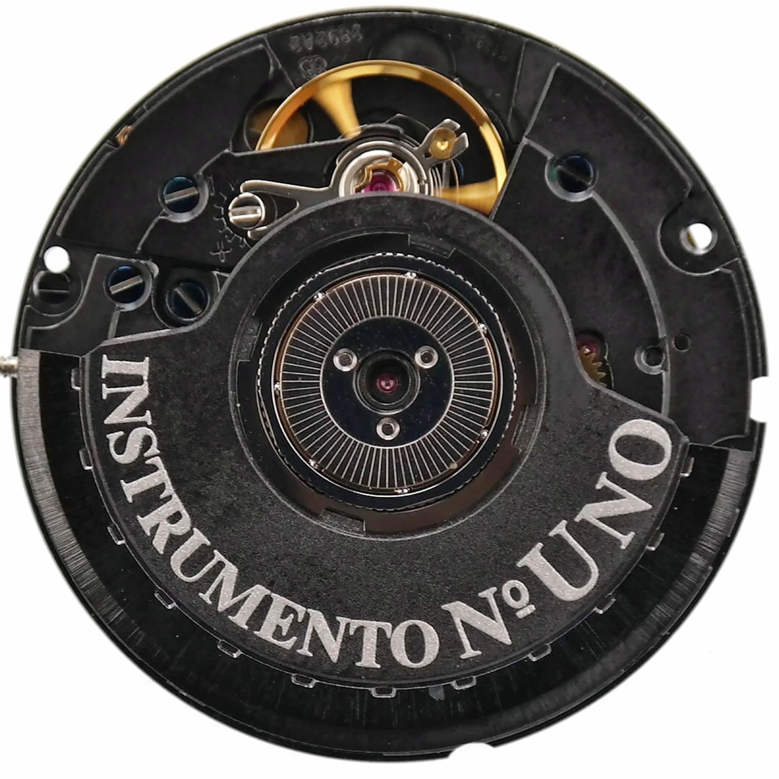 Black PVD, blue screws, oscillating mass marked “instrumento N° Uno“.