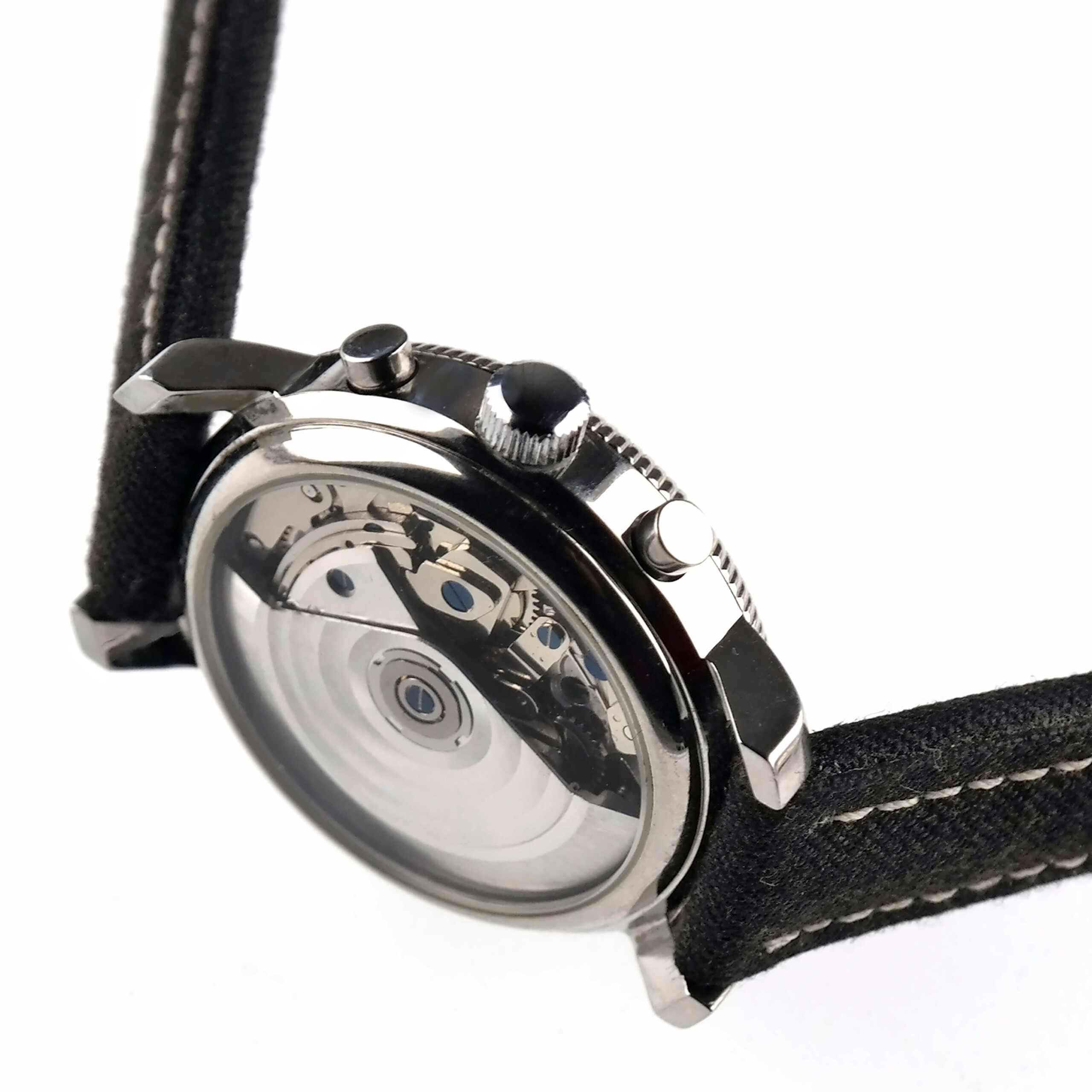 The case diameter is ca. 38 mm (not including the crown and the pushers), in stainless steel, with a see-thru case-back showcasing the oeil-de-perdrix decorated 7751 movement with blue screws.