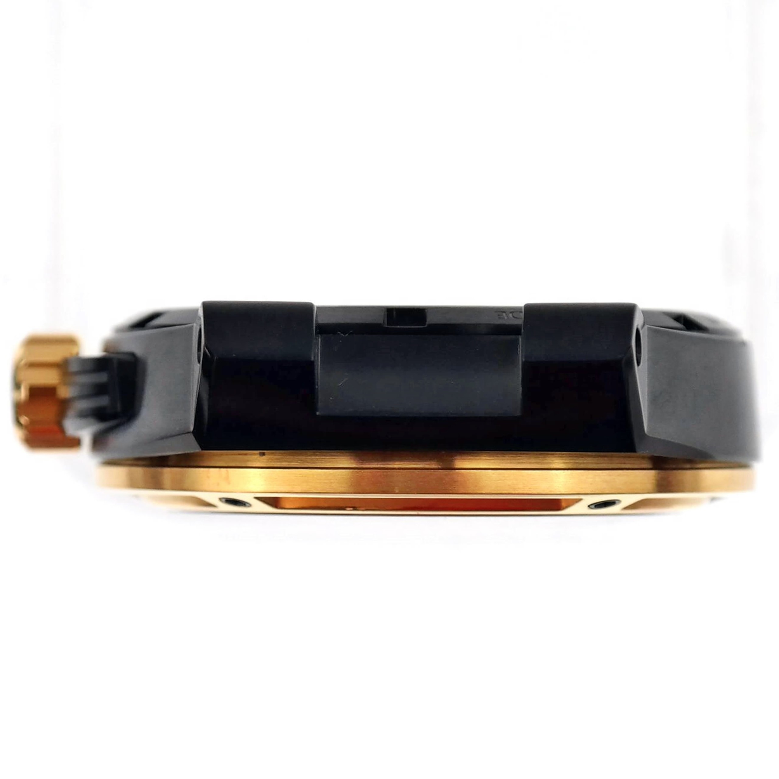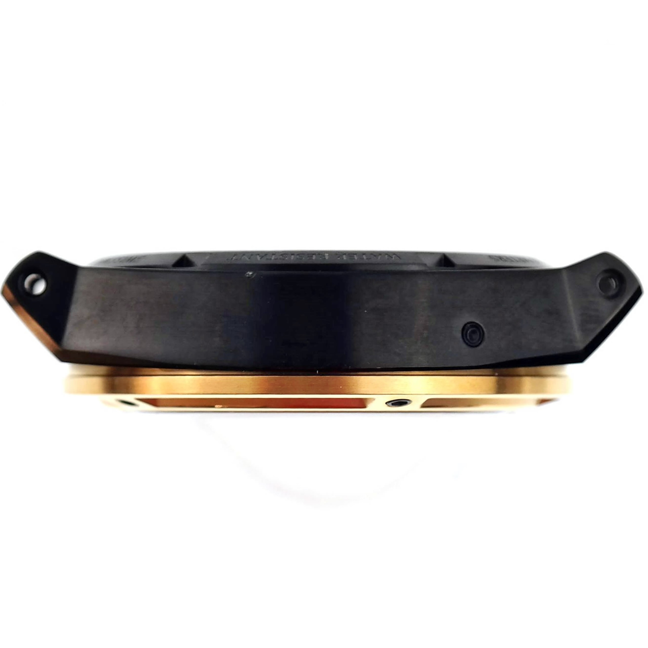 Black PVD steel with gold plated bezel and crown, screw-down see-thru case-back.