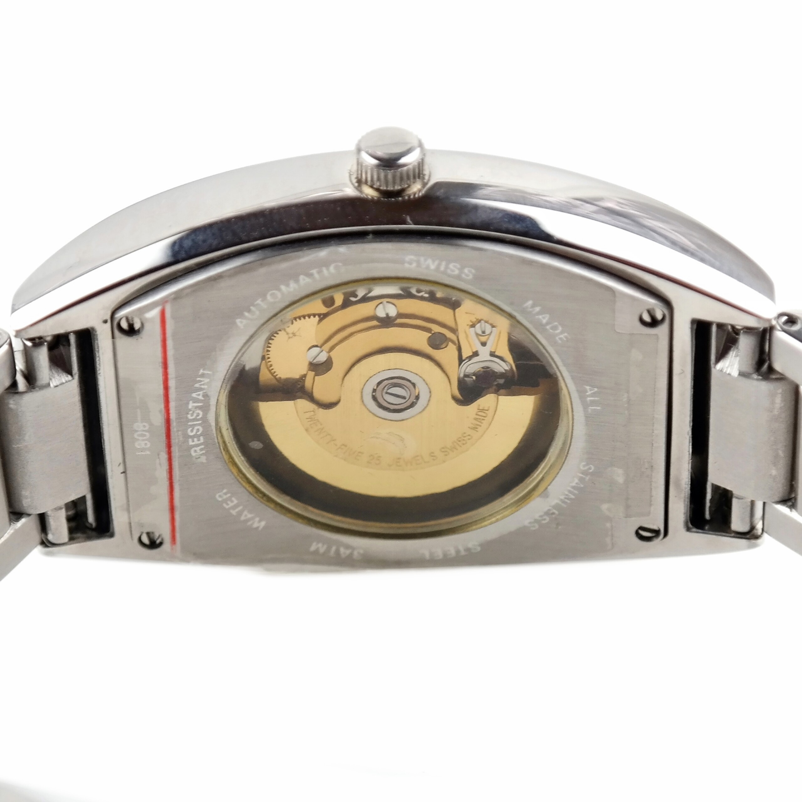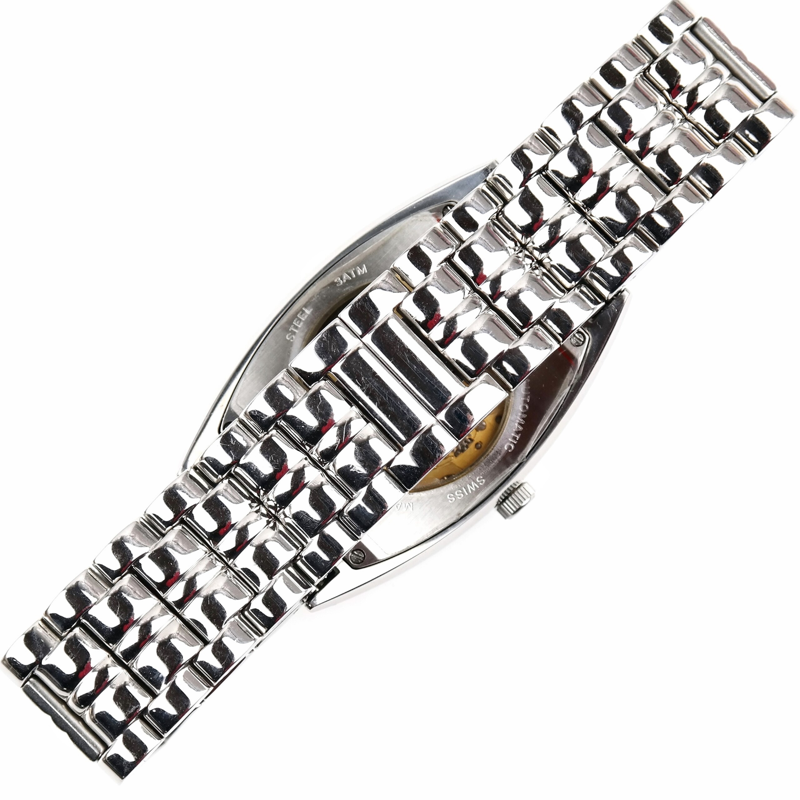 See-thru case-back marked: SWISS MADE | ALL STAINLESS STEEL | 3ATM WATER RESISTANT | AUTOMATIC | 8081. Oscillating weight marked: TWENTY-FIVE 25 JEWELS | SWISS MADE .