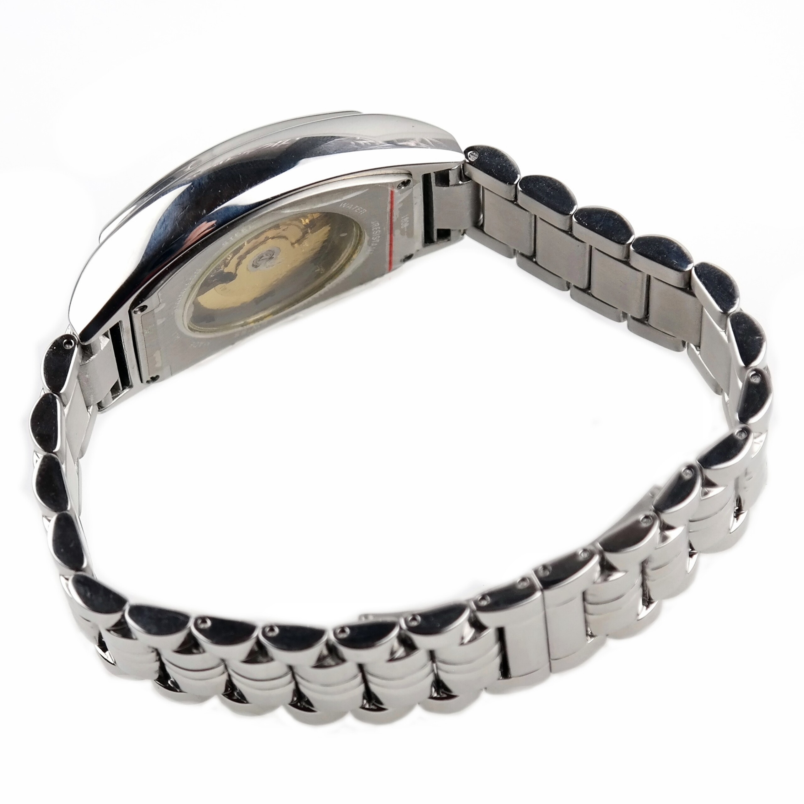 Ca. 35 mm x 41.5 mm diameter (not including the crown or the lugs) FM Casablanca barrel/tonneau style stainless steel watch case. Mineral crystal for both front and case-back.