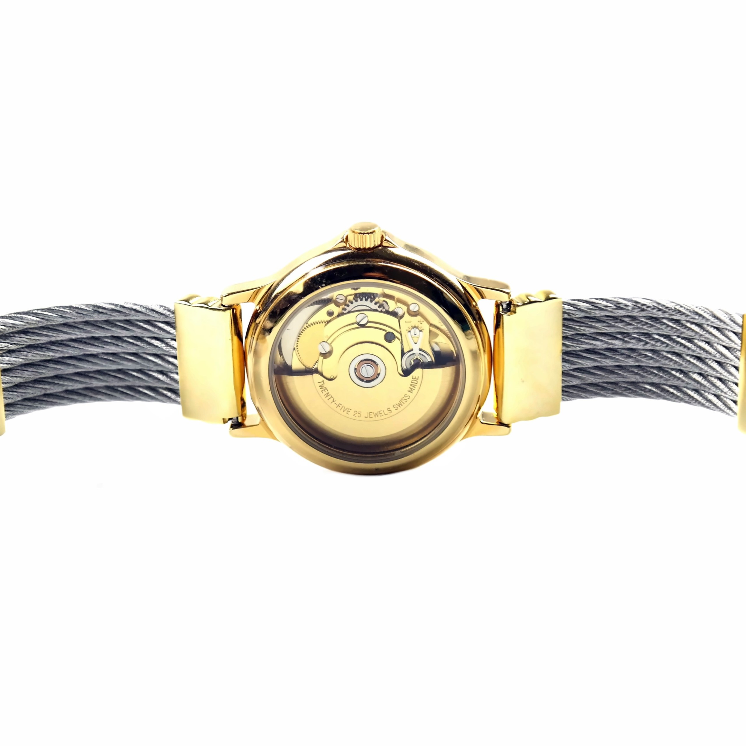 See-thru case-back showing the gold tone finishing automatic movement, oscillating weight marked TWENTY-FIVE 25 JEWELS | SWISS MADE .