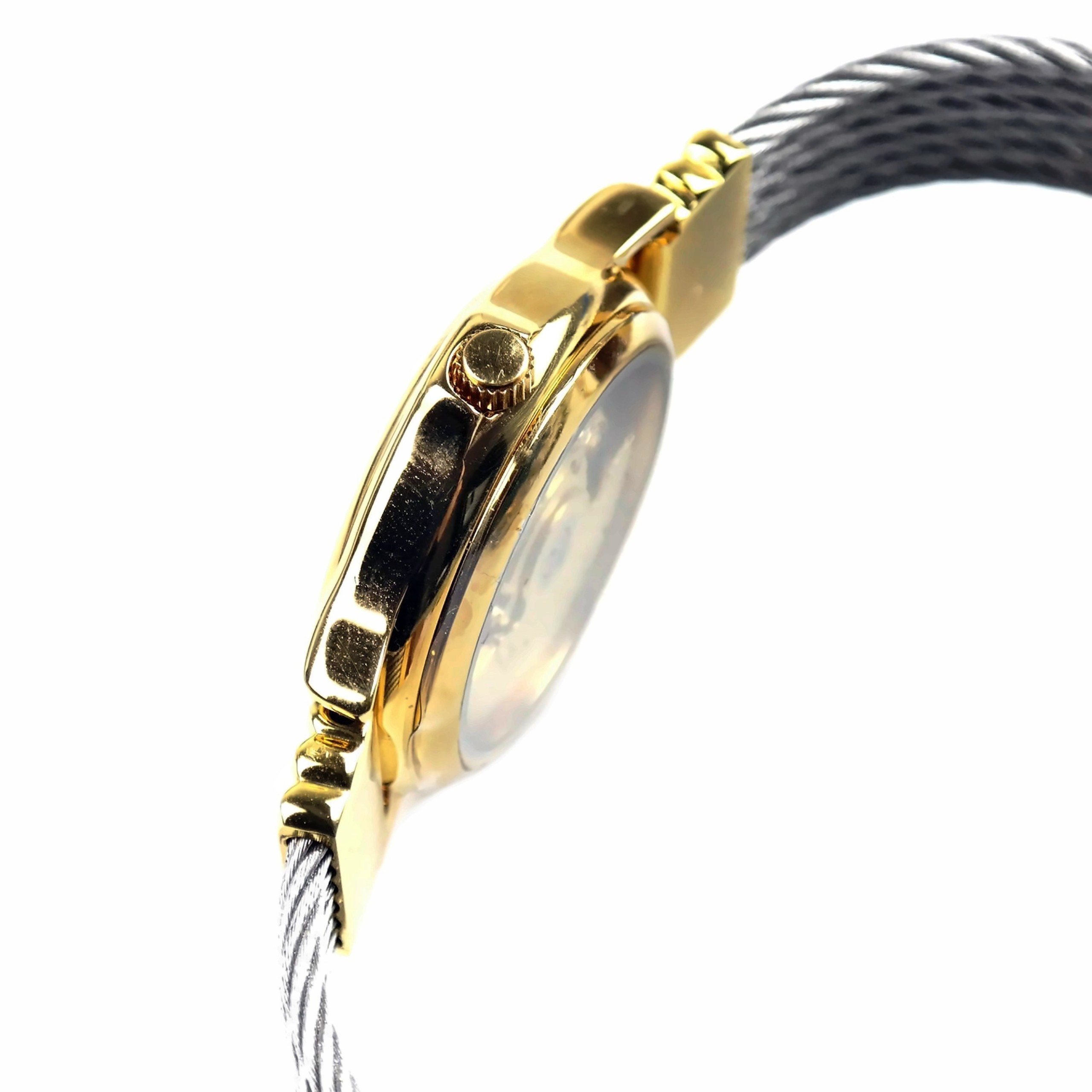 Ca. 35 mm diameter (not including the crown) gold plated stainless steel watch case with mineral crystal.