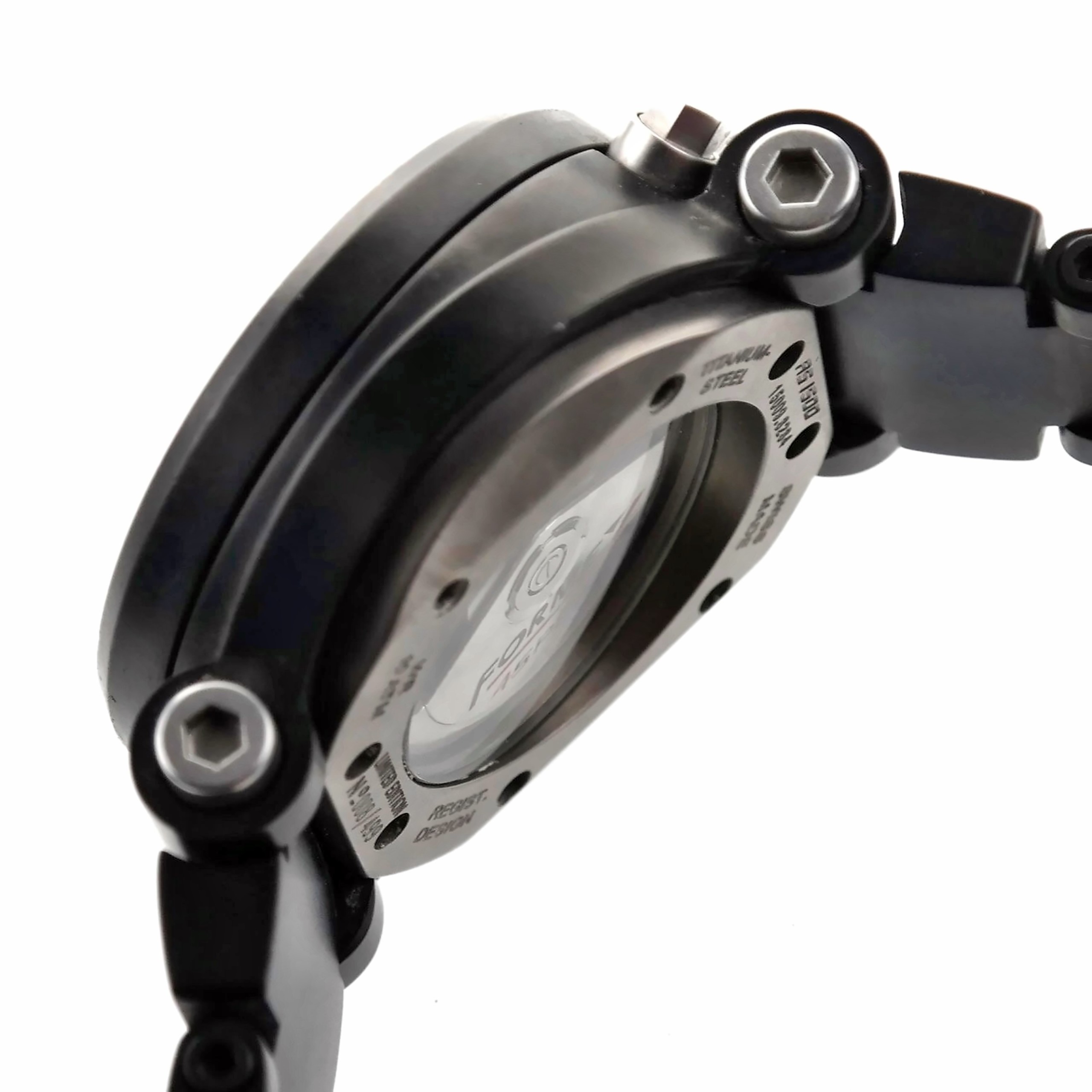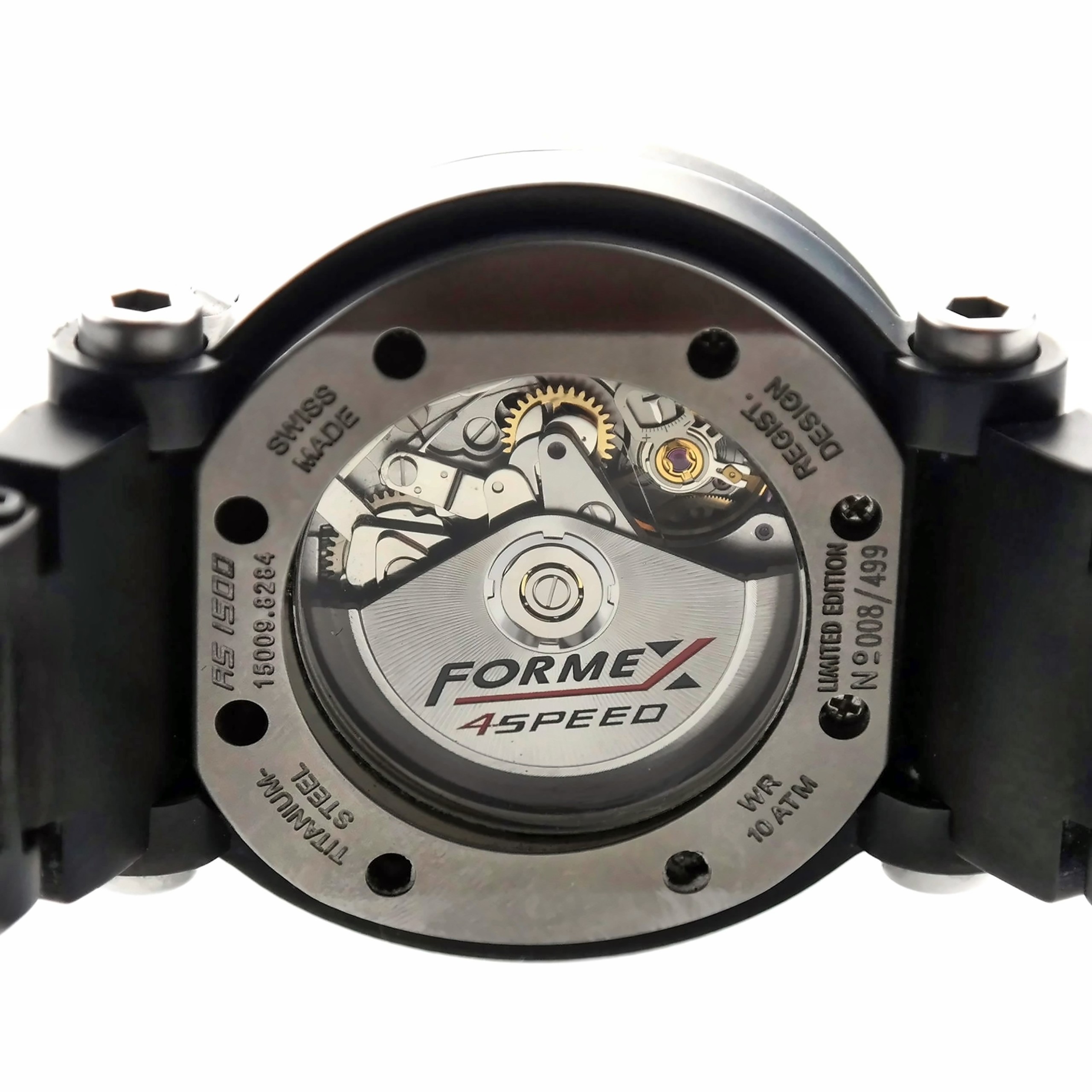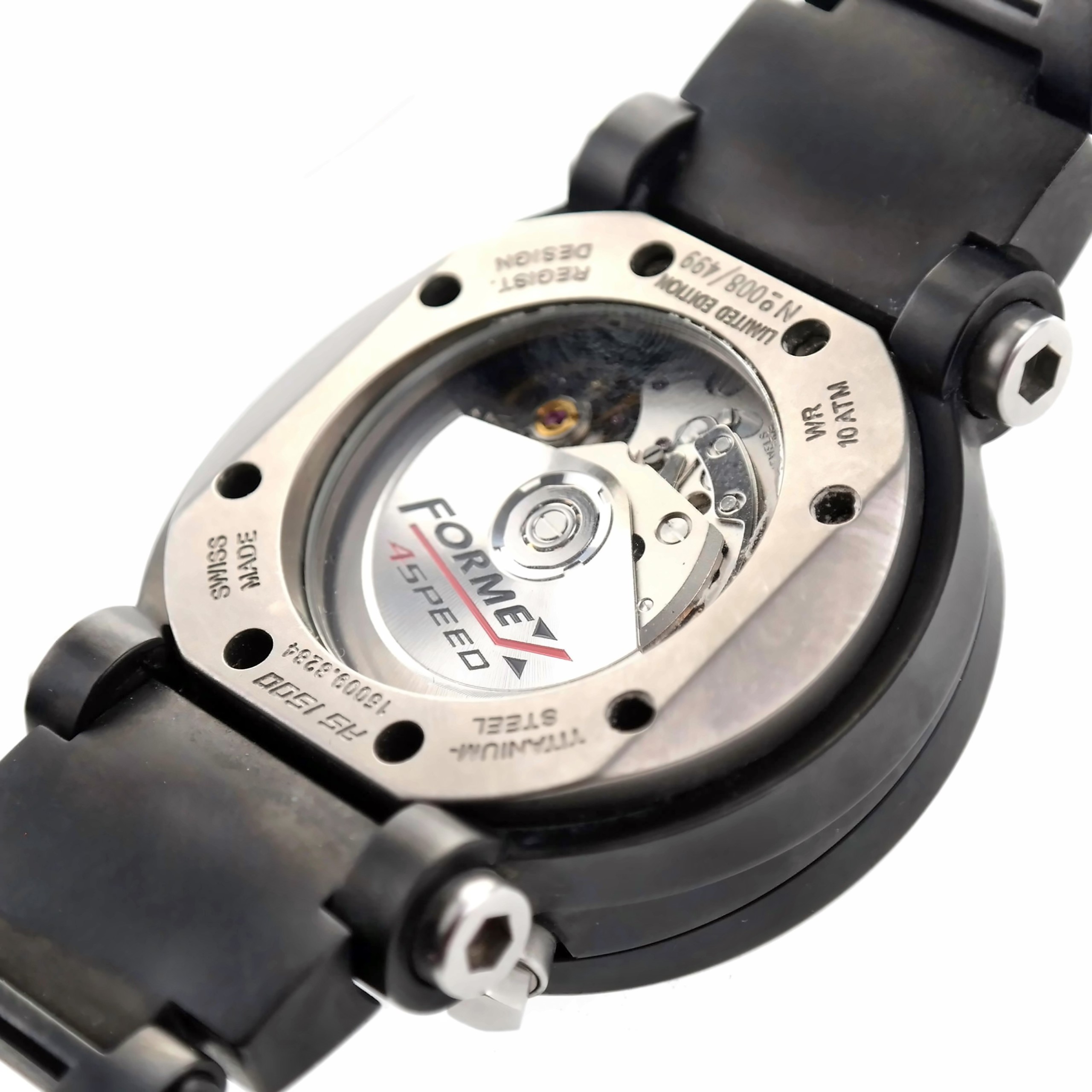 See-thru case back secured by eight screws, marked AS 1500 | 15009.8284 | TITANIUM – STEEL | WR 10 ATM | REGIST. DESIGN | SWISS MADE | LIMITED EDITION Nº 063 / 499