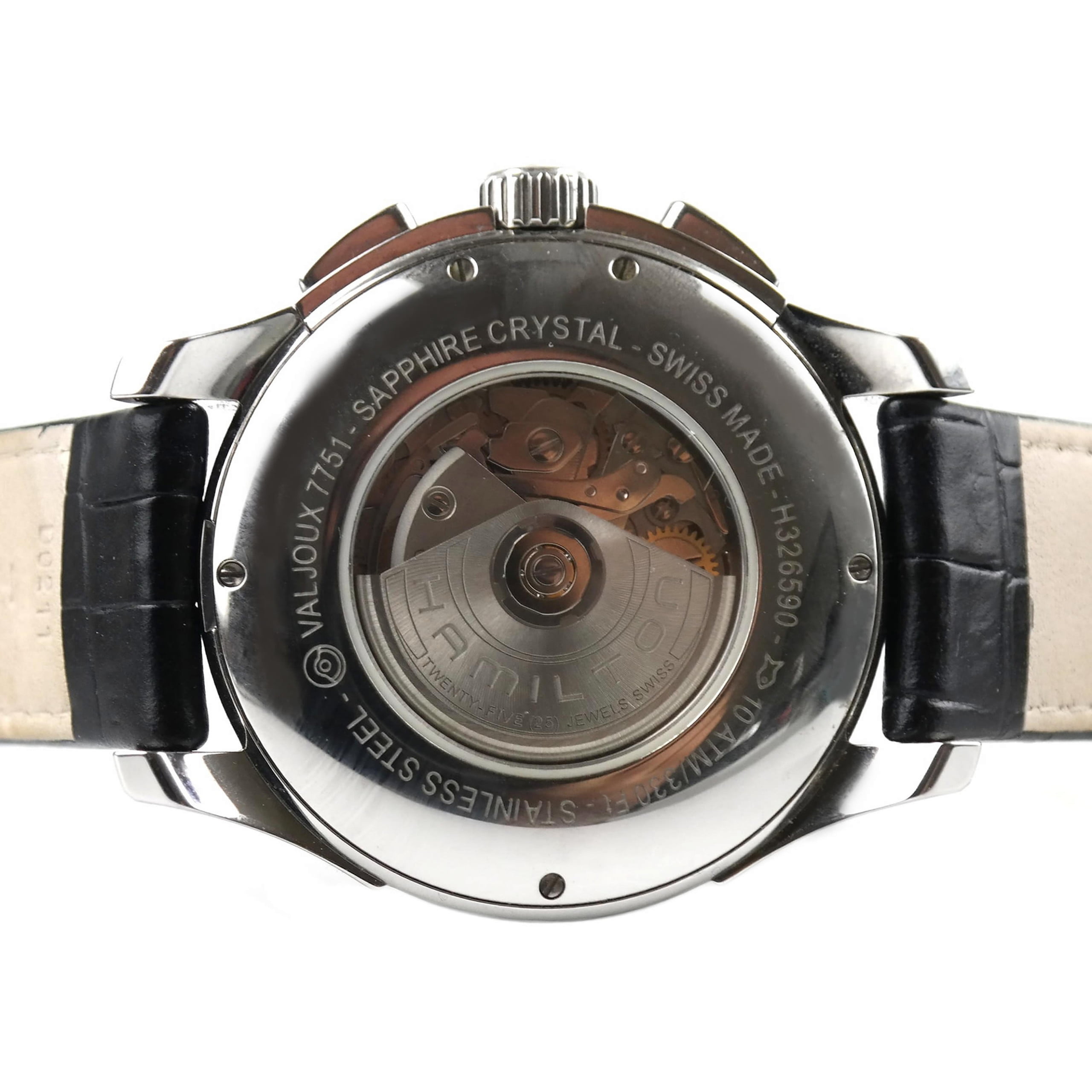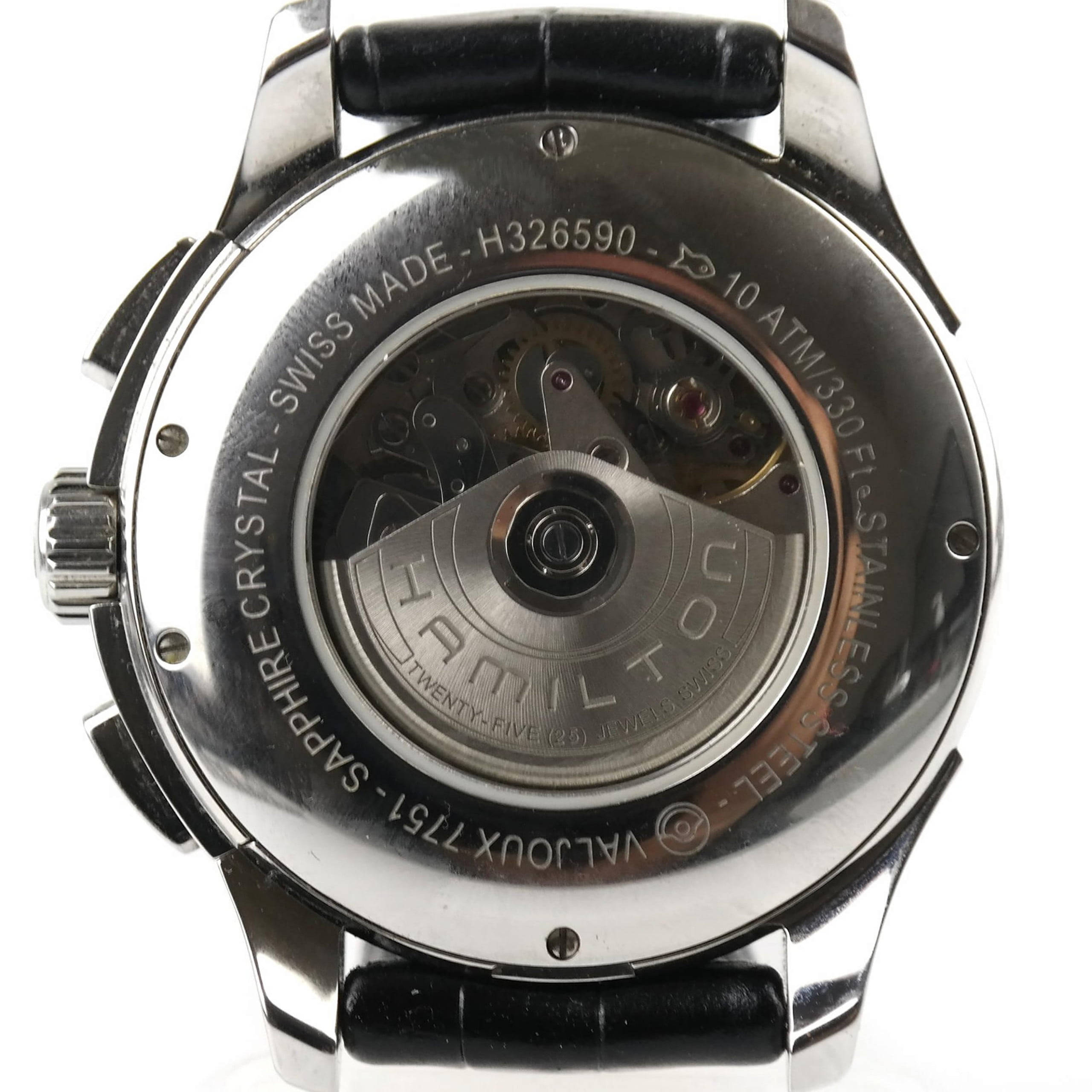 See-thru case-back secured by five screws, marked H326590 | 10 ATM/330 Ft | STAINLESS STEEL | VALJOUX 7751 | SAPPHIRE CRYSTAL | SWISS MADE.