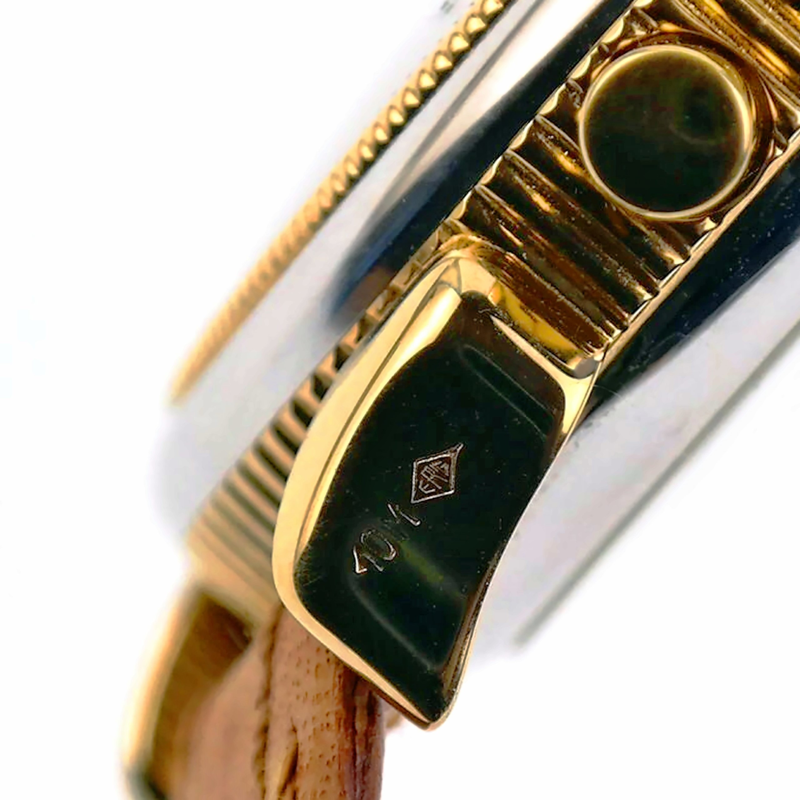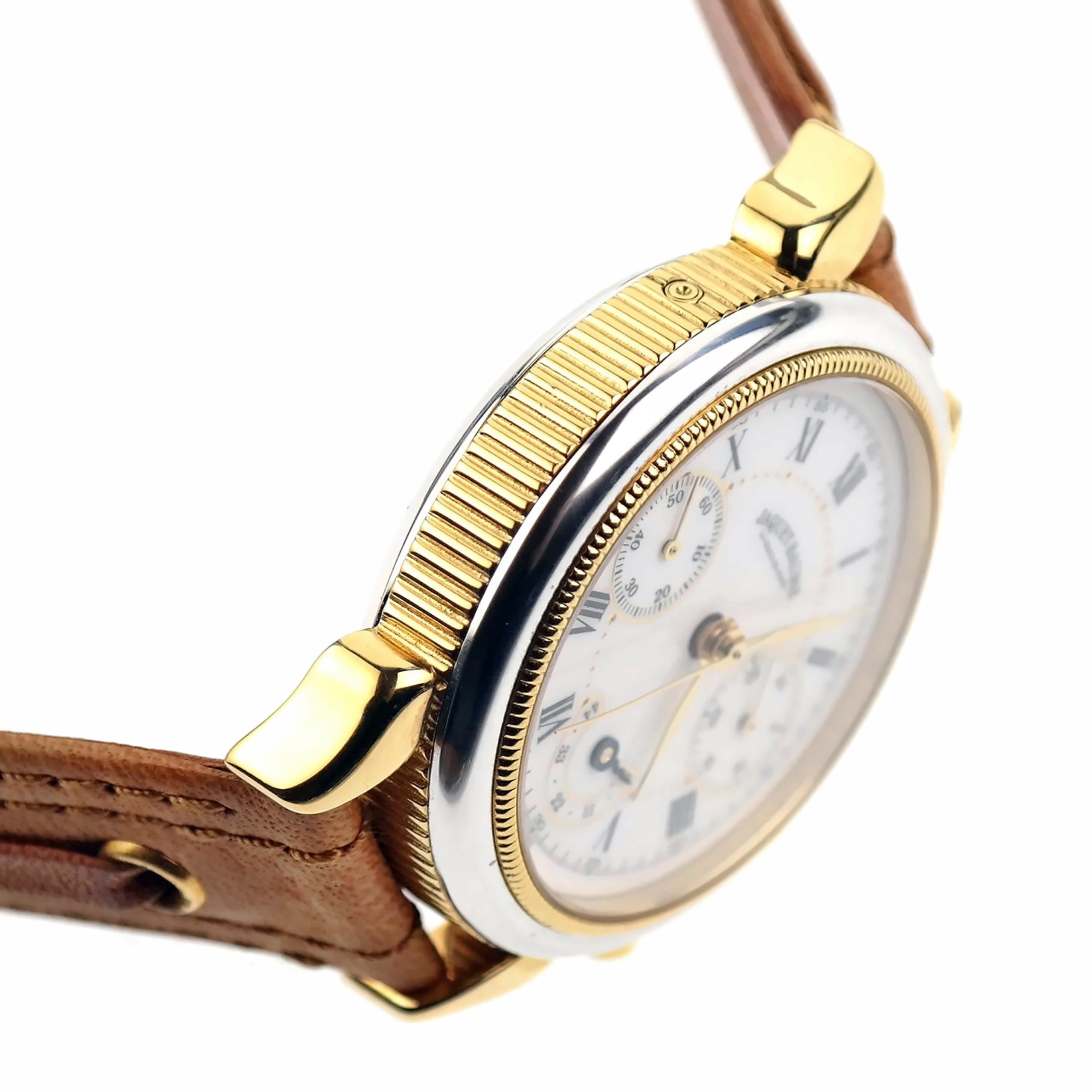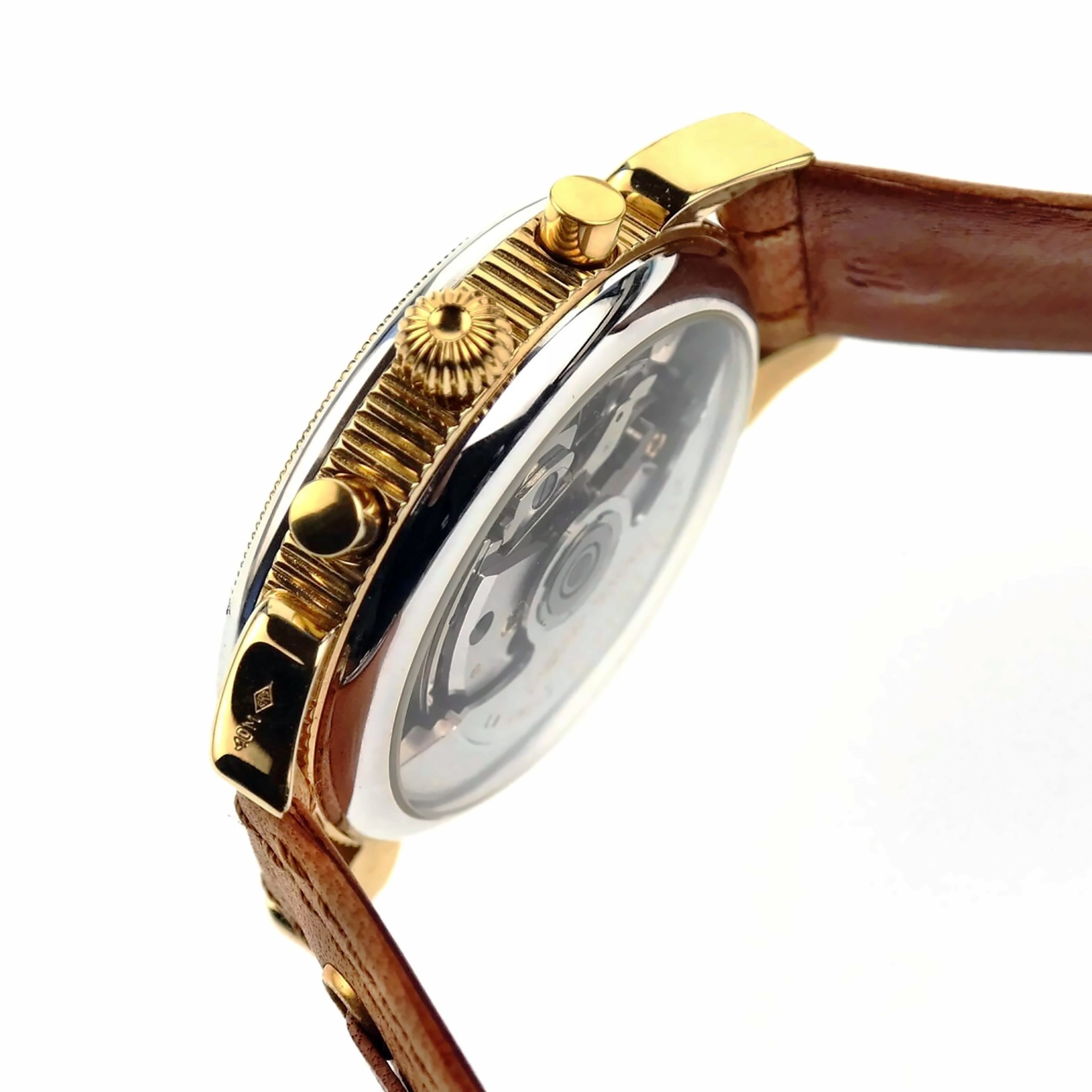 Ca. 38 mm diameter (not including the crown or the pushers) dual-tone gold plated Breguet type watch case.