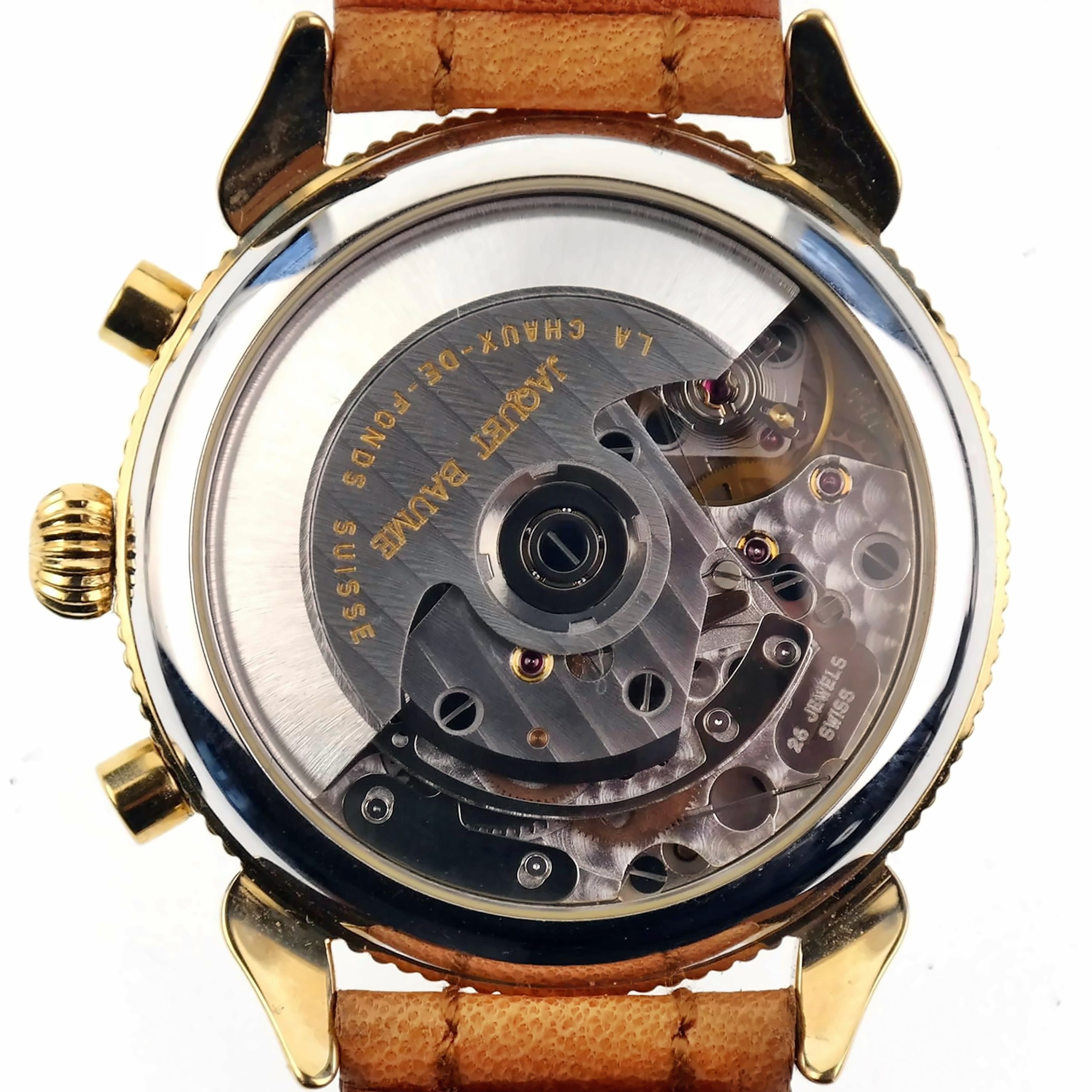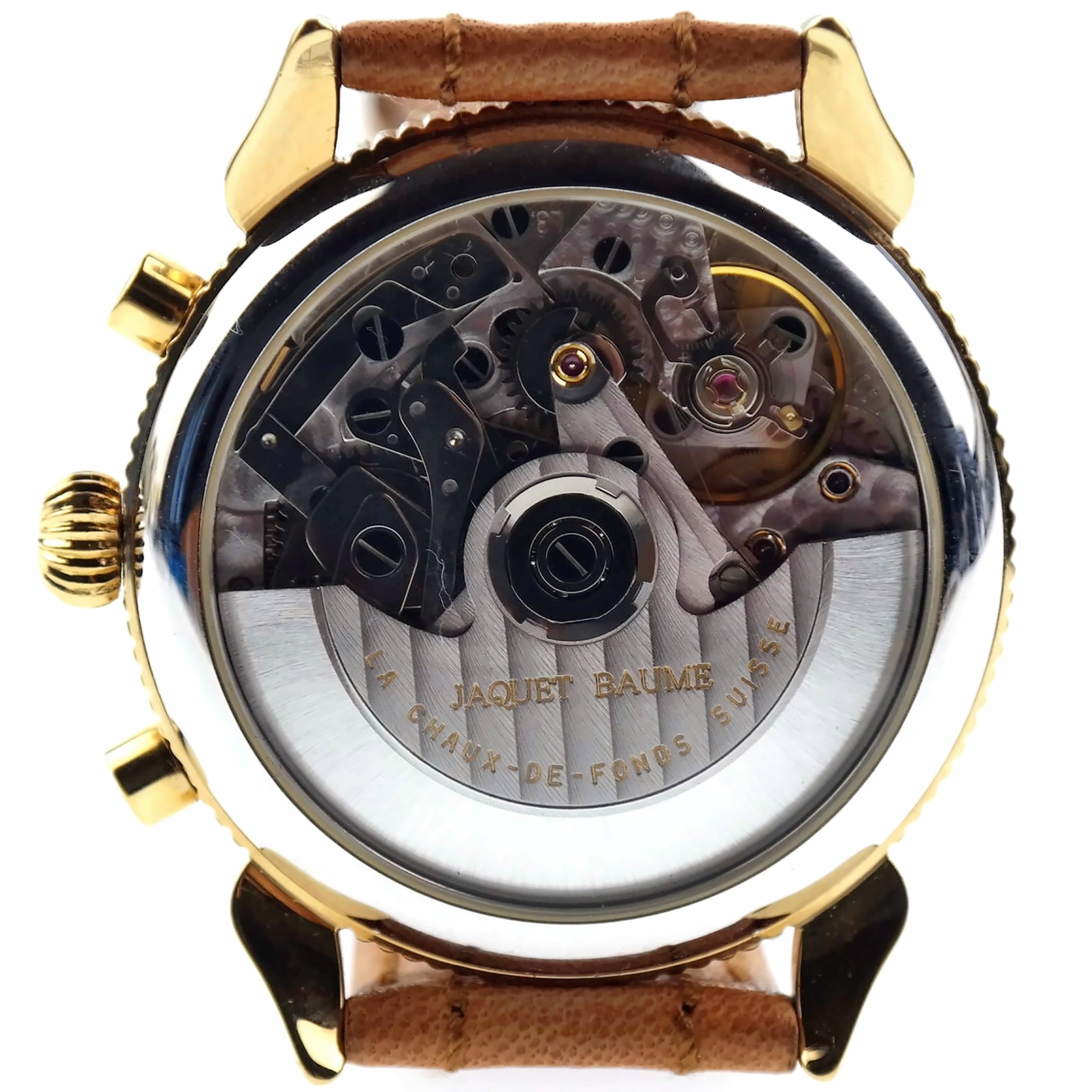 See-thru case-back, oscillating weight marked: JAQUET BAUME | LA CHAUX-DE-FONDS | SUISSE.