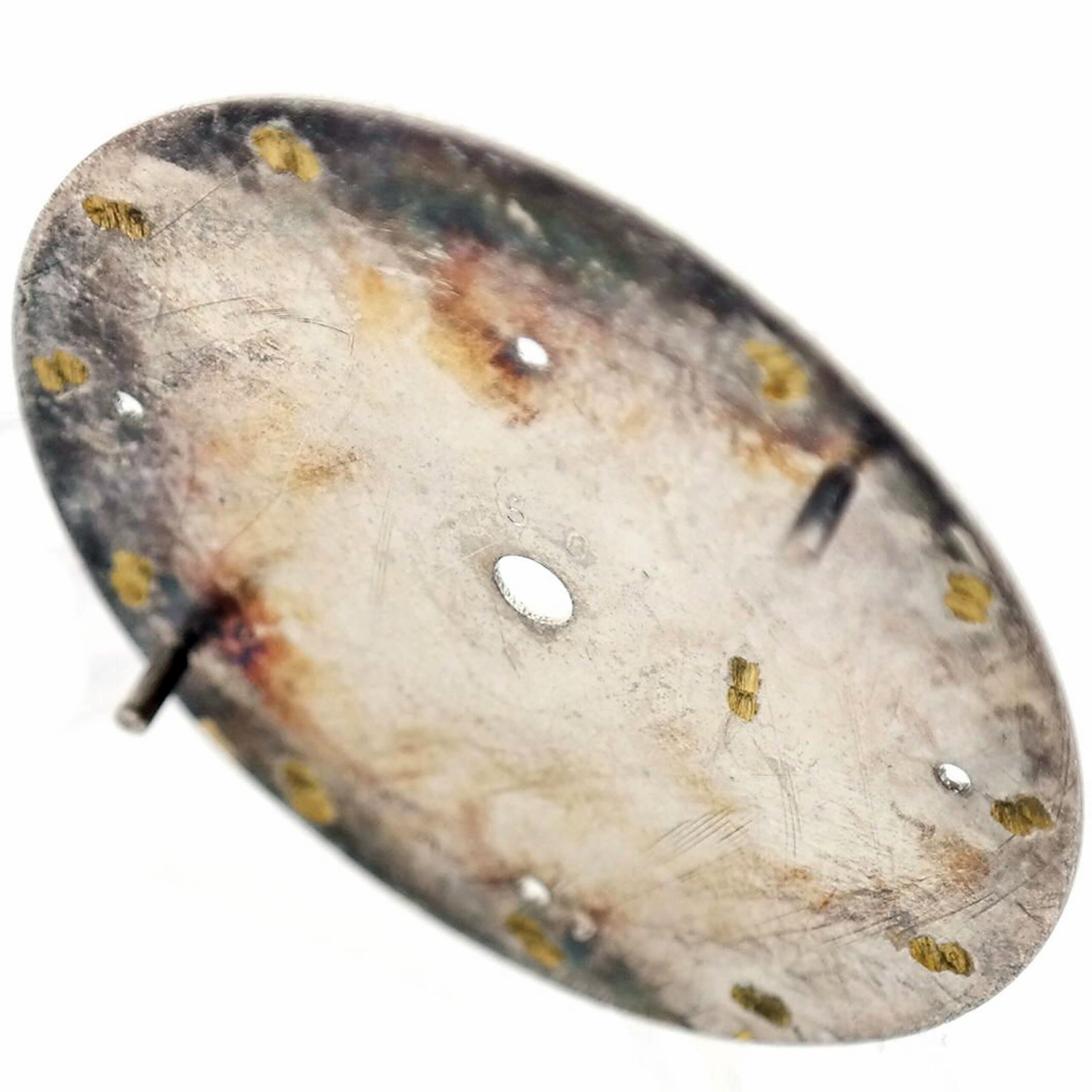 Ca. 36 mm diameter, silver face with blue square hour markers, black numerals and gold accents.