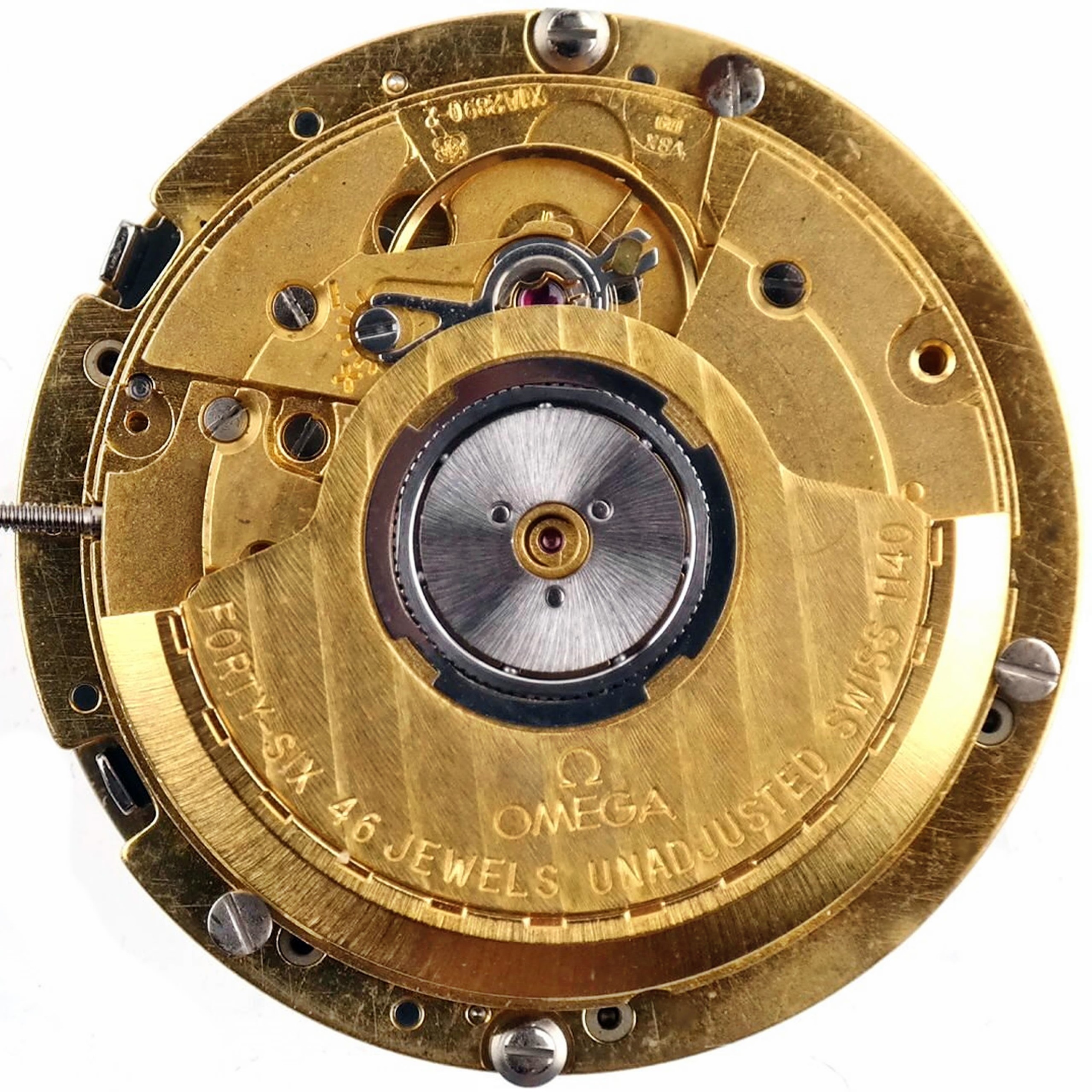The oscillating weight is decorated with “Cotes de Geneve” stripes and is engraved Ω | OMEGA | FORTY-SIX 46 JEWELS | UNADJUSTED | SWISS | 1140.