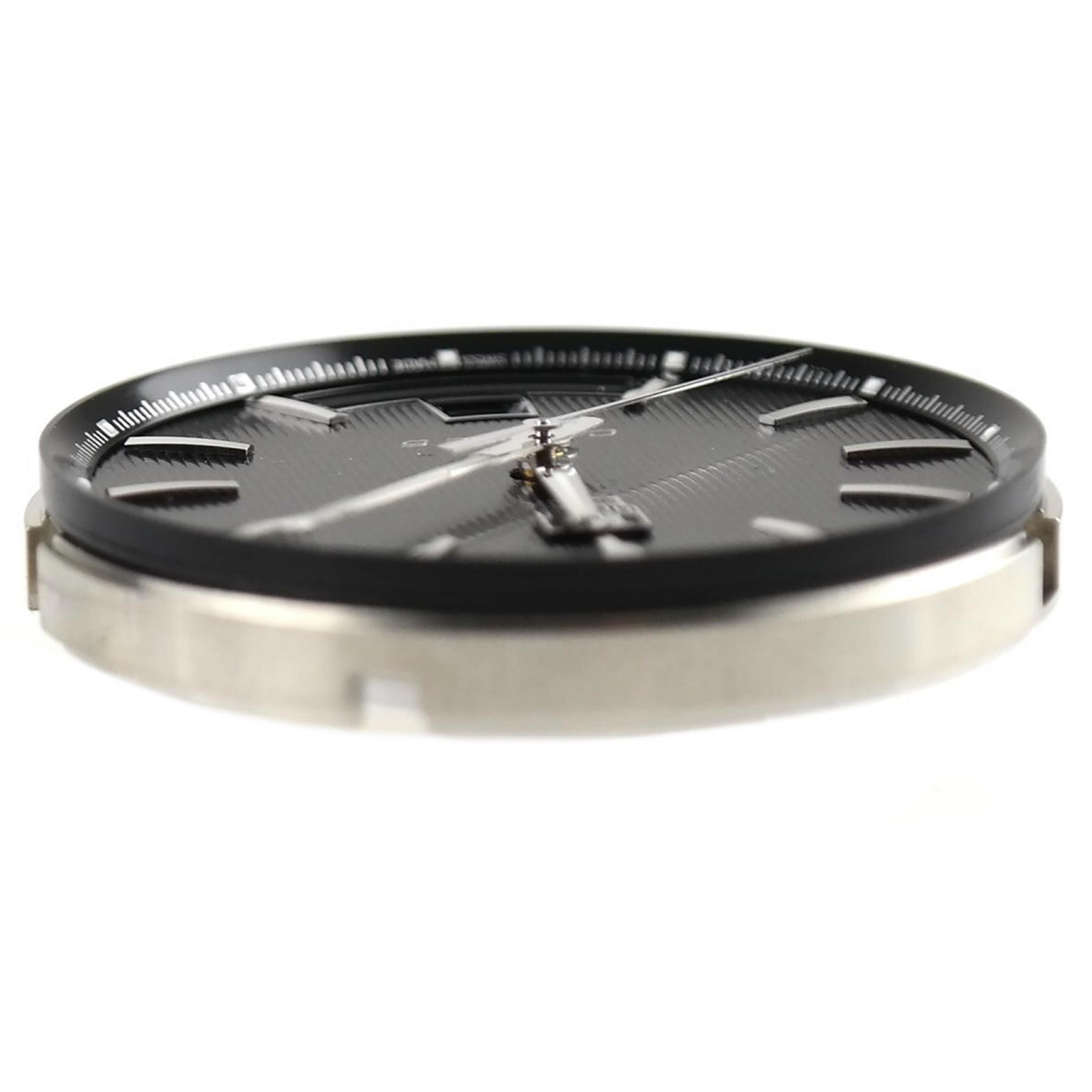 Black dial with stripes. Applied indexes. Date opening at 06.00 position, day opening below.