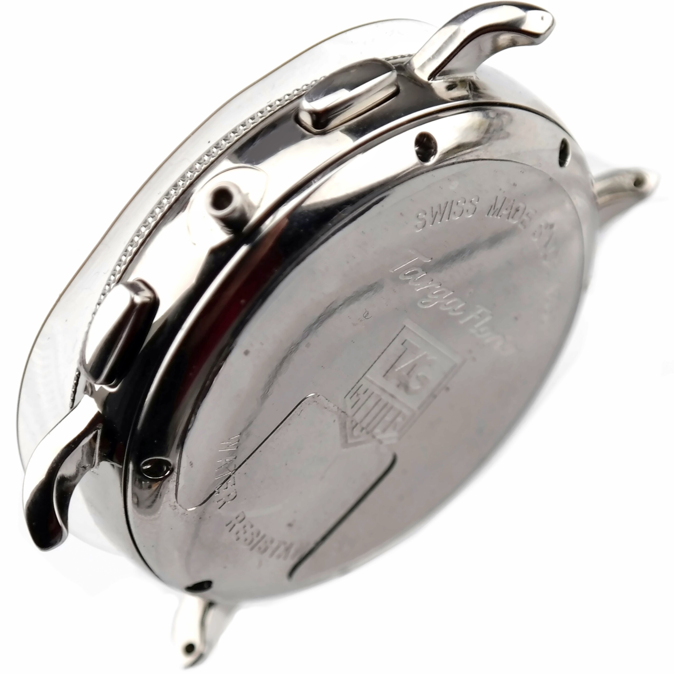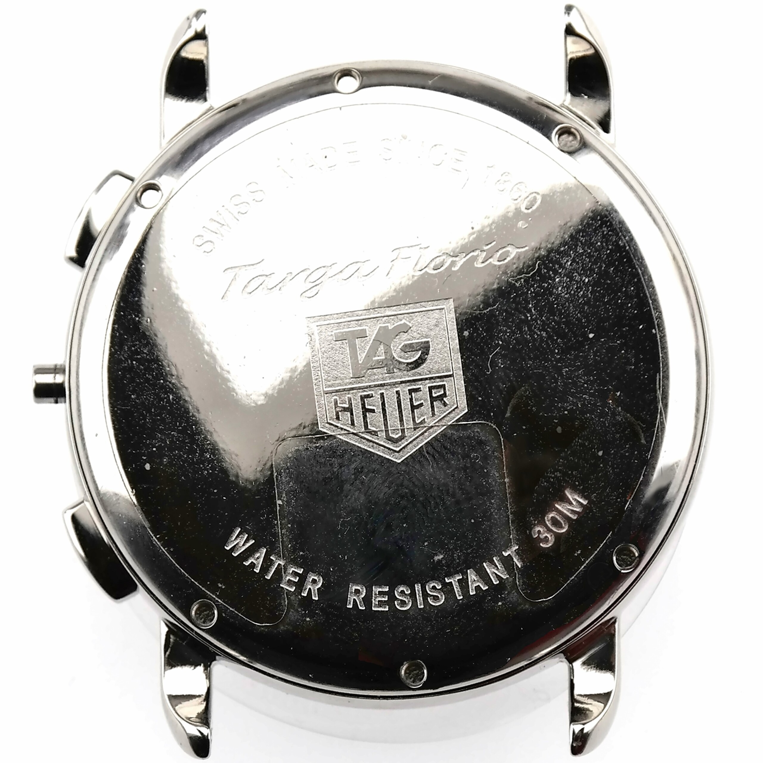 Case-back marked with the TAG Heuer logo, Targa Florio| SWISS MADE SINCE 1860 | WATER RESISTANT 30 M.