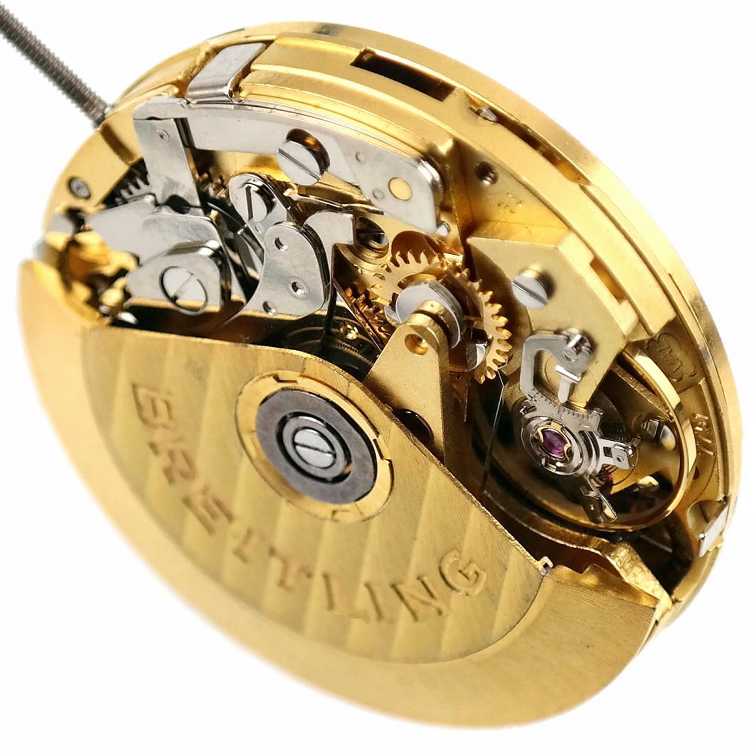 The movement is in gold tone, the oscillating weight is decorated with “Cotes de Geneve” stripes and is marked BREITLING.