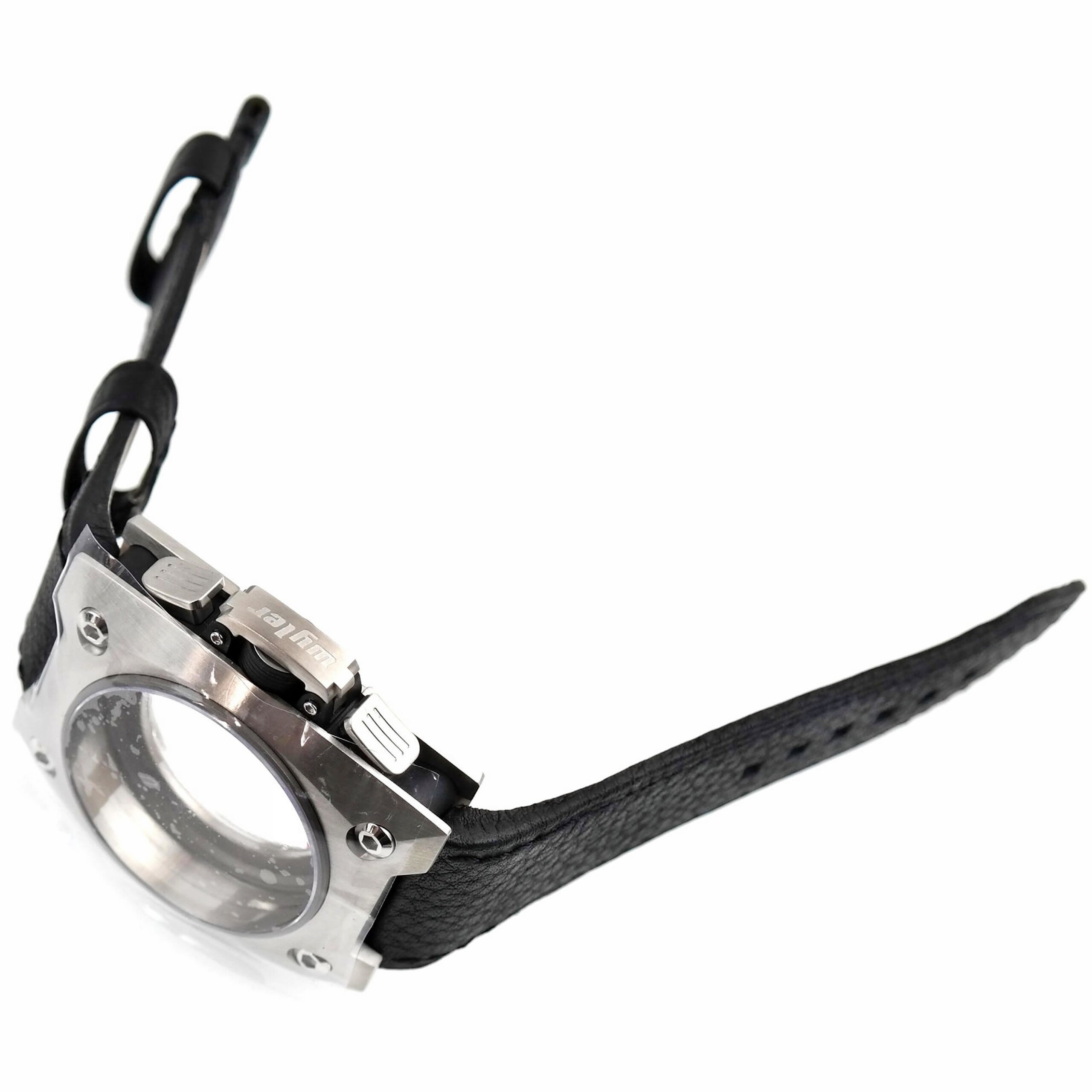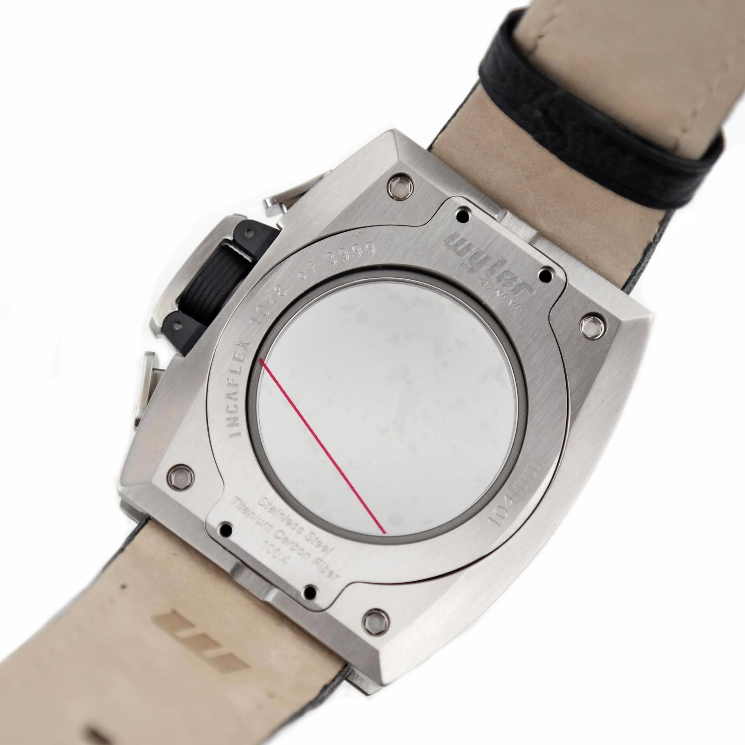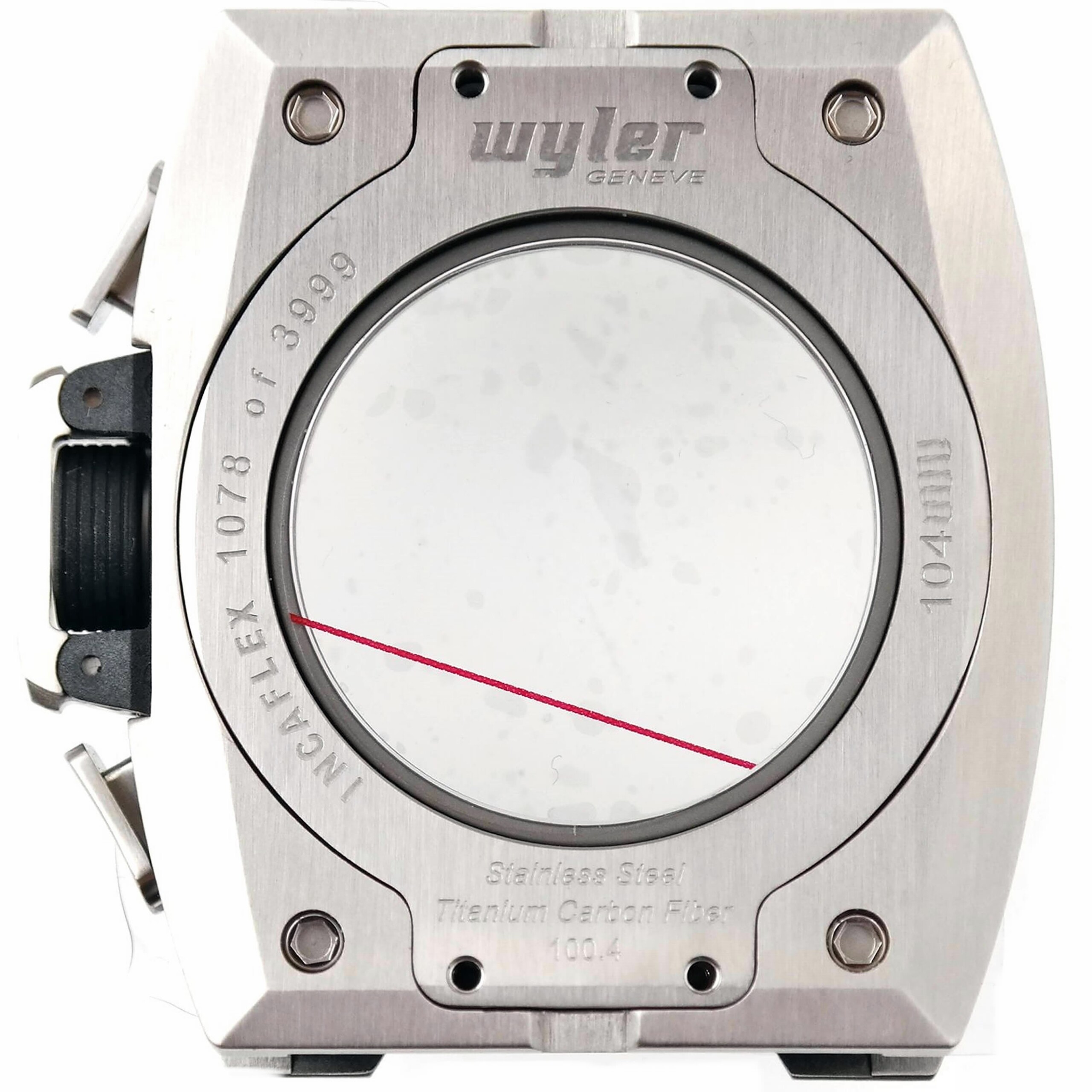 The case-back is marked wyler GENEVE | INCAFLEX | XXXX (watch number) of 3999 | Stainless Steel | Titanium | Carbon Fiber | 100.4 | 104XXX (serial number).